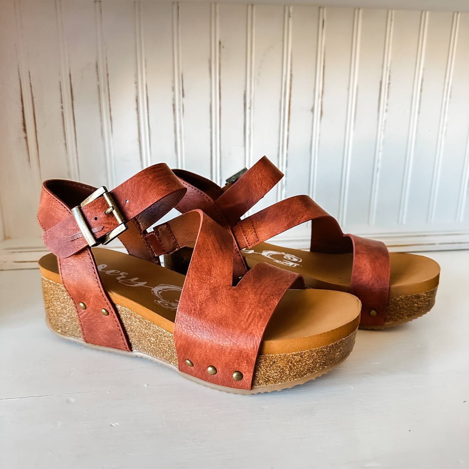 The perfect height for day to night. Introducing the Women's Shayne Wedge Sandal by Very G, a stylish addition to your footwear collection. Featuring a chic strappy design, an adjustable buckle, and a comfortable cushioned footbed, these sandals provide both fashion and comfort. With a 2” heel and 1.5” platform in a rust hue, they fit true to size for a flattering look. Designed with a round toe and low, wedge heel, they are perfect for any occasion.