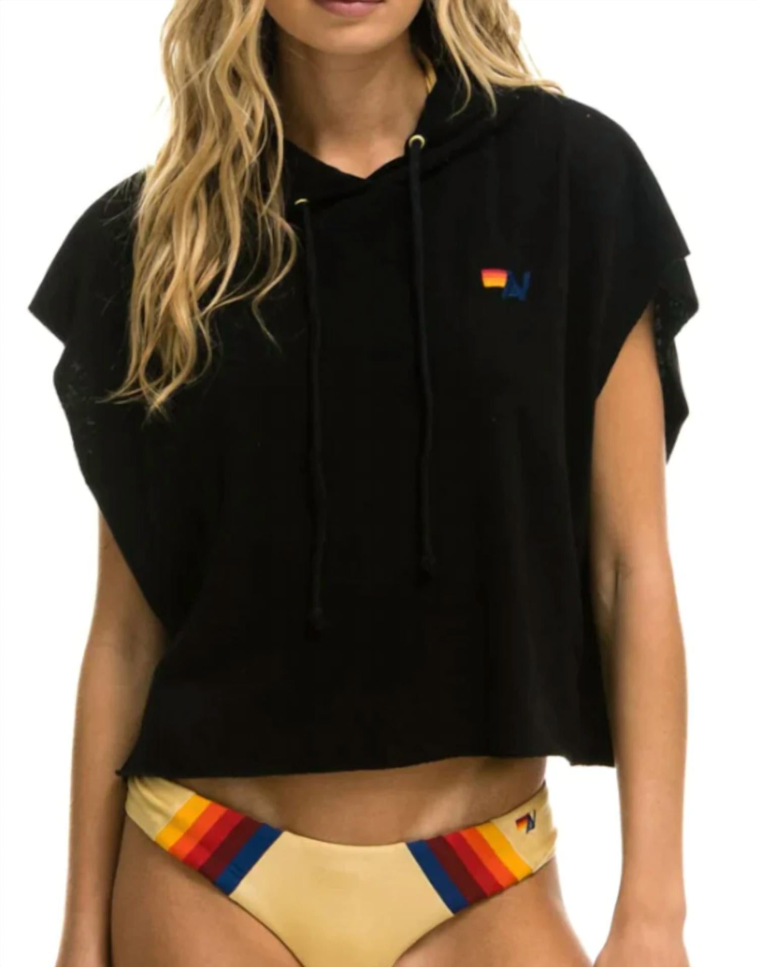 Whether you're running around town or lounging at home, this sweatshirt works for both. Introducing the Logo Embroidery Sleeveless Crop Hoodie by Aviator Nation, a must-have for athleisure enthusiasts. This cap sleeve hoodie features a relaxed cropped fit, perfect for both sunny adventures and lounging in style. Crafted from a tri-blend fabric of 50% cotton, 37% polyester, and 13% rayon, it offers unparalleled comfort with a vintage feel. The pull-on closure and hooded neckline make it an ideal choice for effortless game day style.