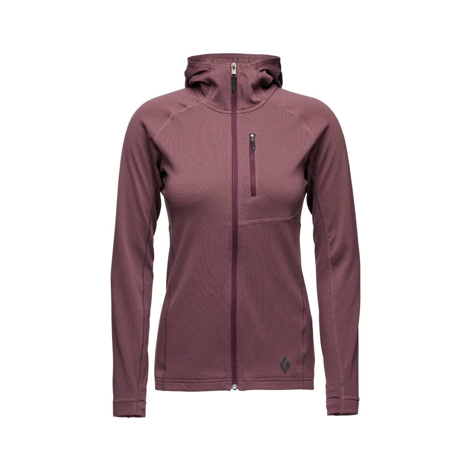 Introducing the Coefficient Hoody by Black Diamond, a must-have for women who love winter fitness and athleisure fashion. Designed with long sleeves and a hooded neckline, this hoody is crafted from Polartec Power Grid Fleece, combining 51% Polyester, 36% Nylon, and 13% Elastane for optimal warmth and breathability. It features a convenient zip closure and a zip chest pocket for practicality. Made in El Salvador, this solid color fig hoody is easy to care for with machine wash and lay flat to dry instructions. The lightweight cuffs with thumb loops and under-the-helmet hood make it perfect for ski tours and alpine ascents.