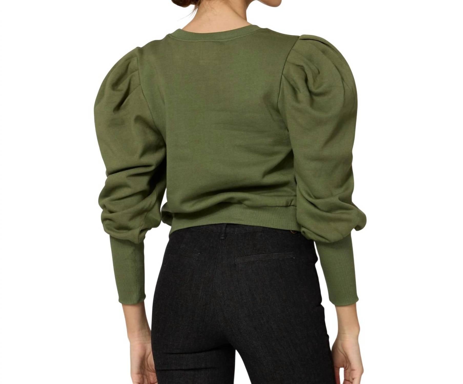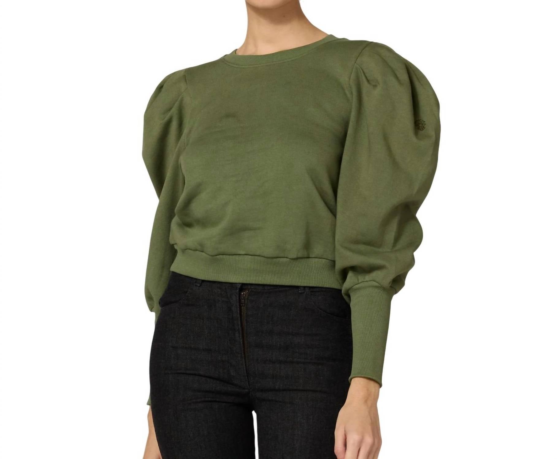 Introducing the Willow by Cleobella, a chic addition to your wardrobe in a serene Army Green. This sweatshirt boasts long puff sleeves and high cuffs, crafted from 100% organic cotton for a cozy feel. Ethically handmade in India, it combines style with thoughtfulness in production. Designed with a crewneck and a pull-on closure, it is easy to wear and perfect for a touch of flair on chilly fall days. Care: Hand wash cold, lay flat to dry or opt for dry cleaning. Ana is 5'9.5" and is wearing a size S.