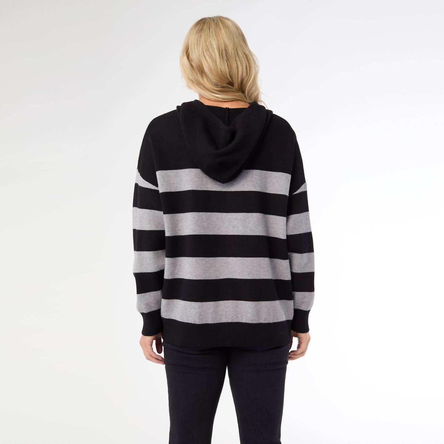 Whether you're running around town or lounging at home, this sweatshirt works for both. Indulge in stylish comfort with the Heavenly-Luxe Stripe Pullover with Hood by COCO + CARMEN, perfect for your fall wardrobe. This chic women's sweatshirt features long sleeves and a cozy hood, tailored in a striking black and light heather grey stripe. Made from a soft viscose blend, it combines practicality with trend-forward maximalist design. Closure: Tie closure.