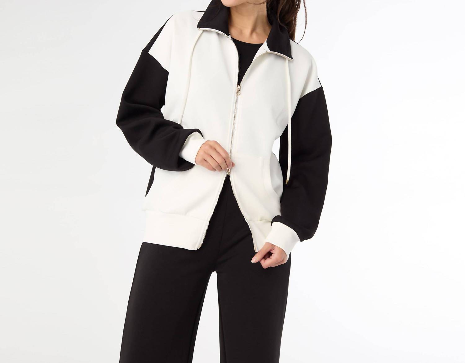 Elevate your casual wardrobe with the Hilarie Two-Tone Zip Front Sweatshirt by COCO + CARMEN, a perfect mix of style and comfort. This minimalist black and ivory sweatshirt features long sleeves and a practical zip closure, ideal for cozy mornings and relaxing evenings. Crafted from soft modal, it provides a delightful fit with the added convenience of functional pockets. Designed for women with a solid pattern and collar neckline, it's a go-to piece for Vacation and cold occasions.