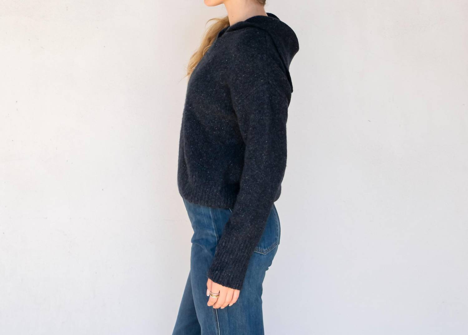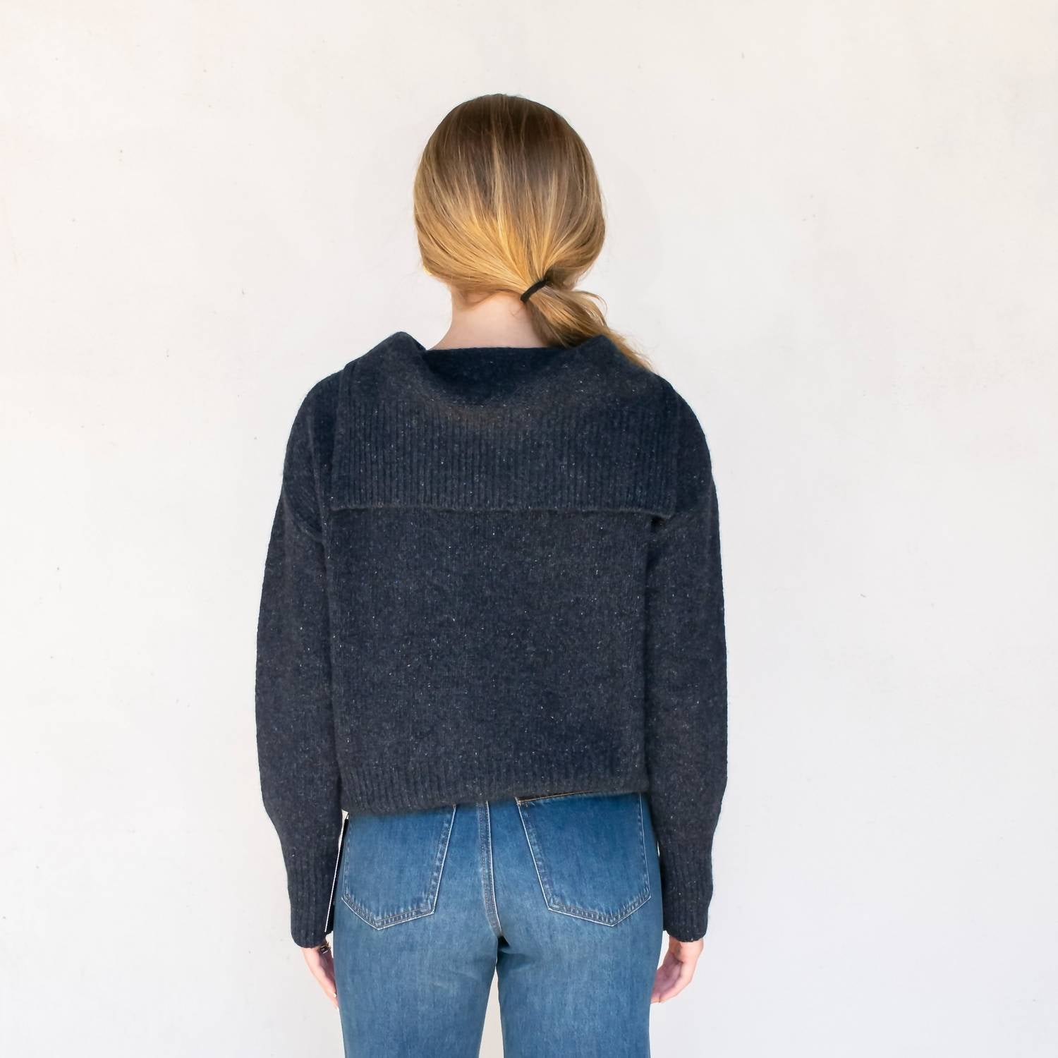 Introducing the Wendy Long Sleeve Sweater by Collaboration, where playful style meets cozy comfort. Made from 100% cashmere, this dark indigo sweater features a textured pattern for added flair. Its pull-on closure and V-neckline make it an easy yet fashionable choice for your fall wardrobe. Please note that it requires dry clean care.