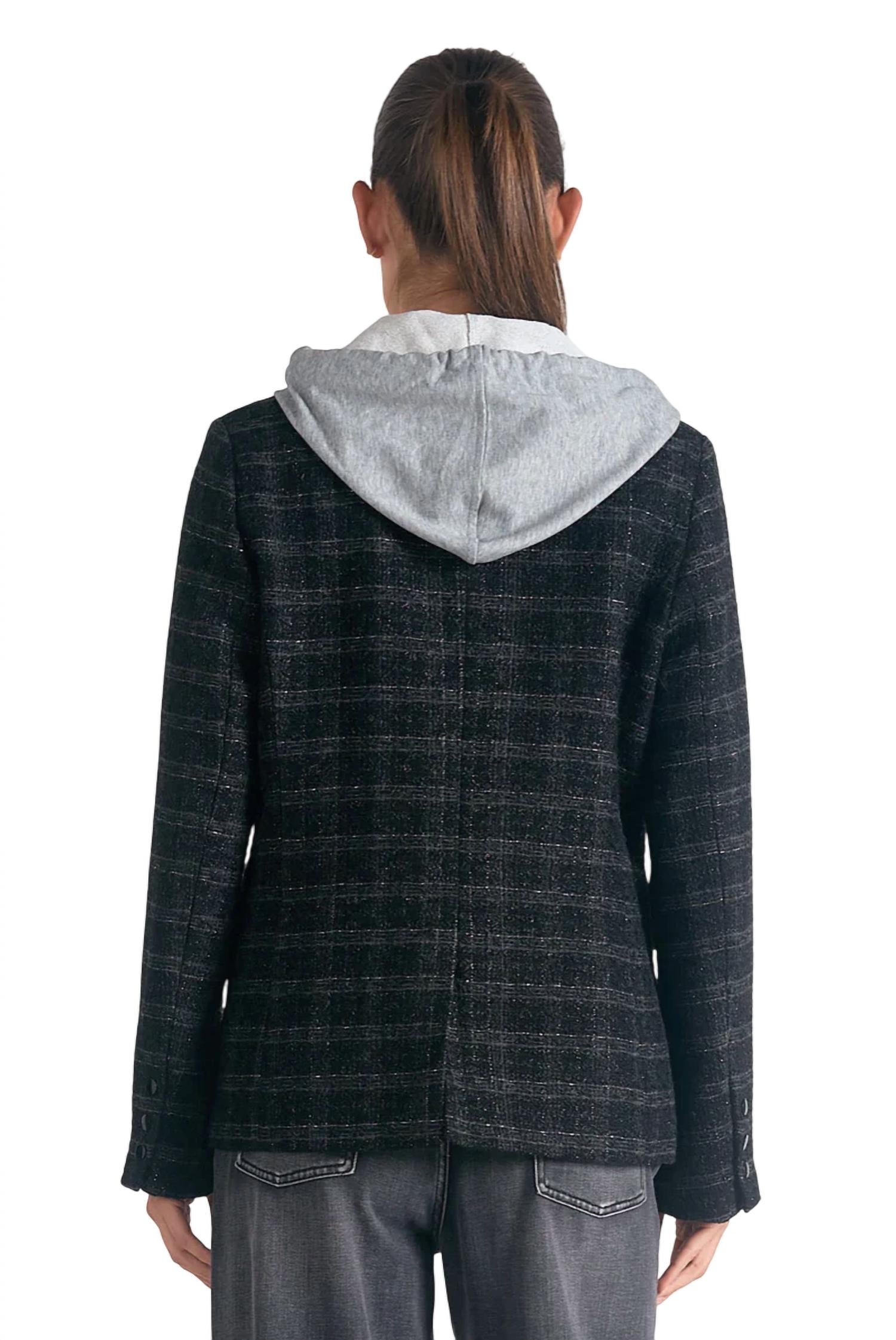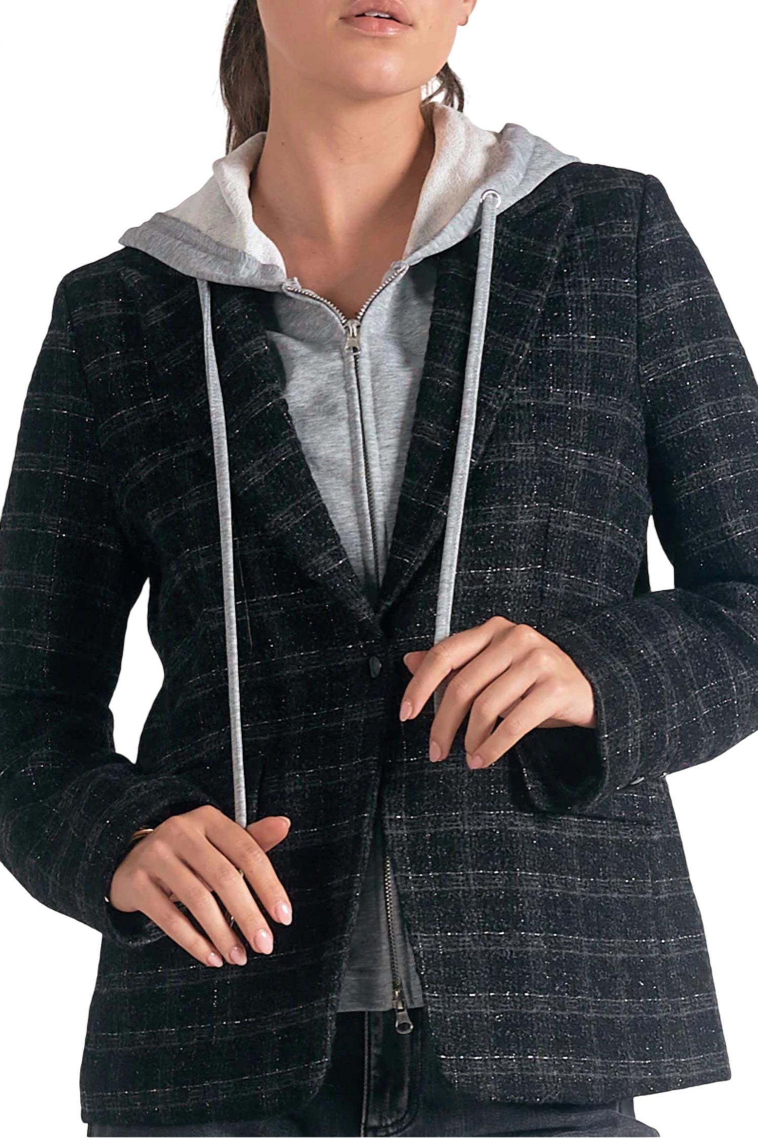 Não importa se você está correndo pela cidade ou relaxando em casa, este moletom serve para ambos. Adicione um toque chique de street style ao seu guarda-roupa com este blazer feminino com detalhe de suéter da Elan, que combina sofisticação refinada com casualidade descolada para um visual ousado e moderno. Mangas compridas. Bolsos frontais com aba. Capuz com cordão, lapela de pico; fechamento frontal com zíper e botão. Forrado. Blazer: 96% poliéster, 4% elastano; moletom com capuz: 80% algodão, 20% poliéster; forro: 100% poliéster.