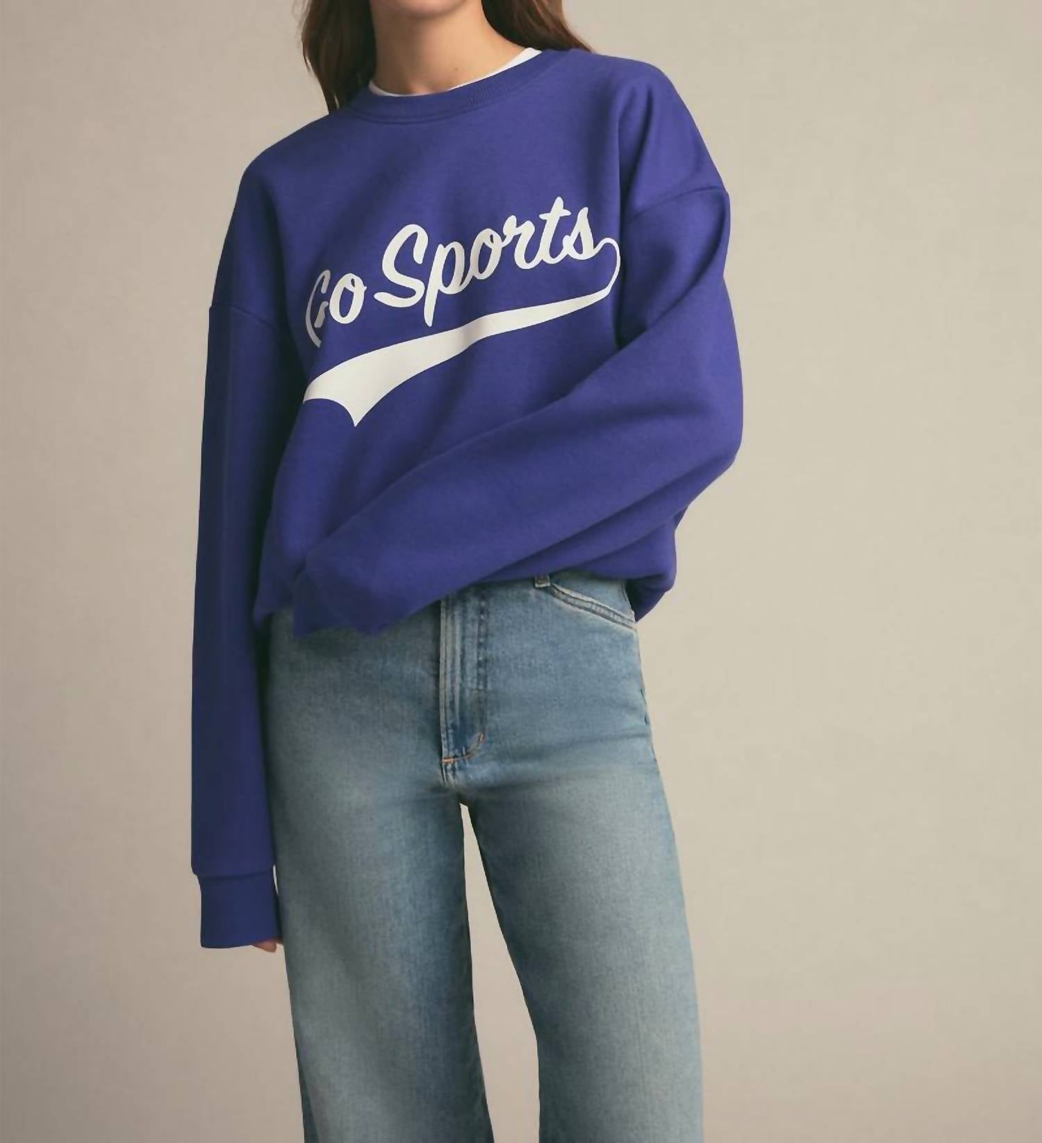 Whether you're running around town or lounging at home, this sweatshirt works for both. Introducing the Go Sports Sweatshirt by Favorite Daughter, a retro-inspired classic for a sporty, laid-back look. This royal blue and white graphic sweatshirt features long sleeves with a drop shoulder design and an oversized, relaxed fit. Crafted from a comfortable cotton blend, it is easy to wear with its pull-on closure. Care: Machine wash.