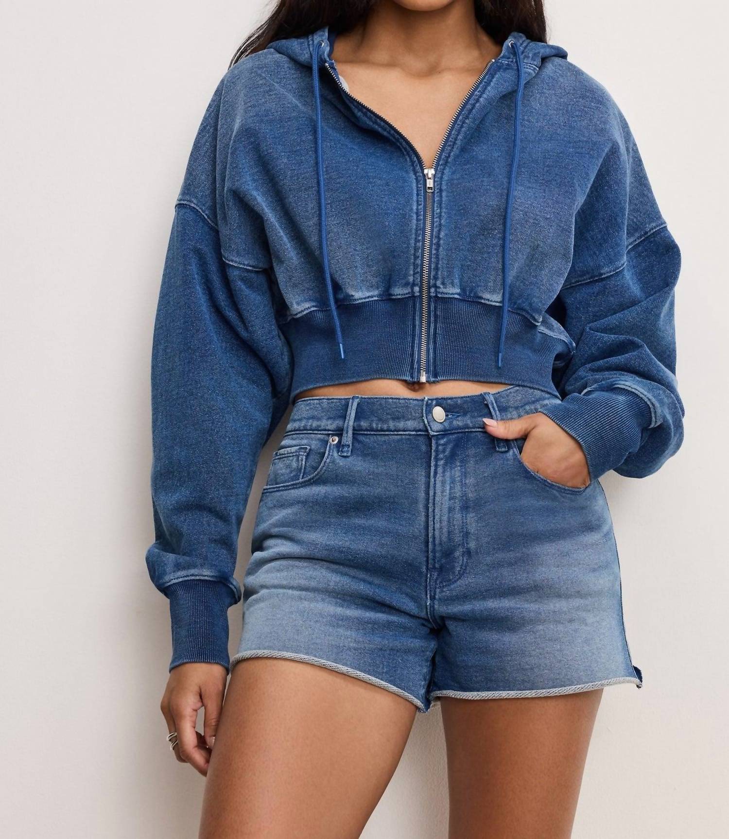 Não importa se você está correndo pela cidade ou relaxando em casa, este moletom serve para ambos. Apresentamos o moletom com capuz Jeanius Zip Up da GOOD AMERICAN, uma peça essencial que combina estilo e conforto em tom índigo. Este moletom feminino possui mangas compridas, capuz fixo e fecho de zíper frontal com bolsos frontais espaçosos para maior praticidade. Confeccionado em 100% algodão, utiliza um tecido fleece felpudo para uma sensação macia e aconchegante que lembra o jeans. Com sua estampa lisa, é um item essencial para qualquer guarda-roupa casual.
