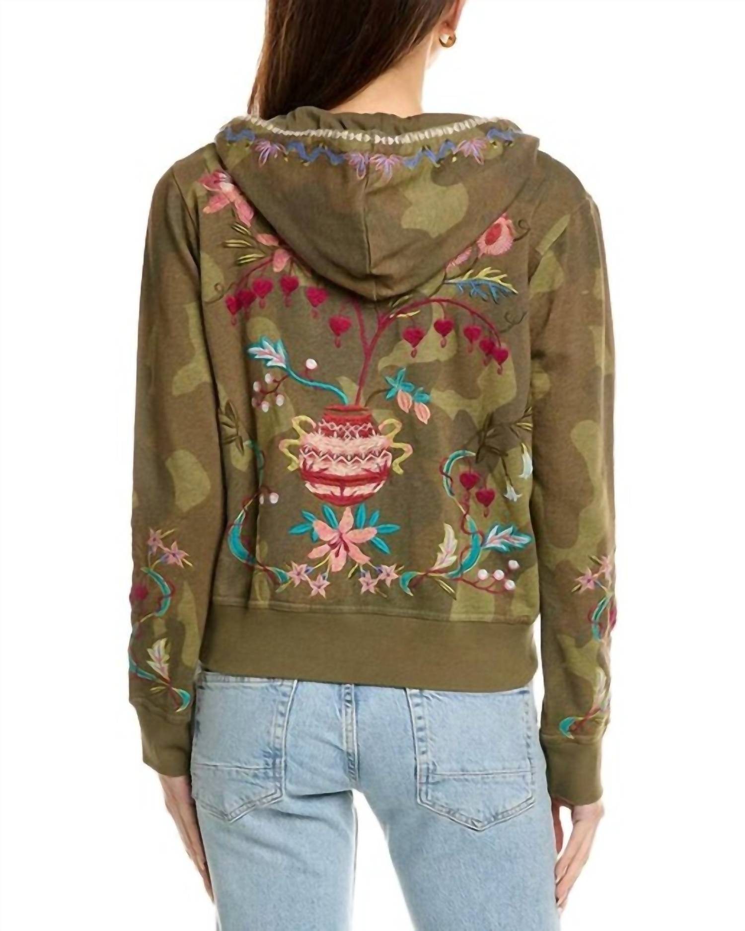 Apresentamos o moletom com capuz Johnny Was Zip-Up Blend, a combinação ideal de estilo e conforto para a mulher antenada na moda. Com uma estampa camuflada de sicômoro, este moletom incorpora a vibe boho eclética com um toque vintage. Mede aproximadamente 60 cm do ombro à bainha e inclui um design estiloso com zíper.
