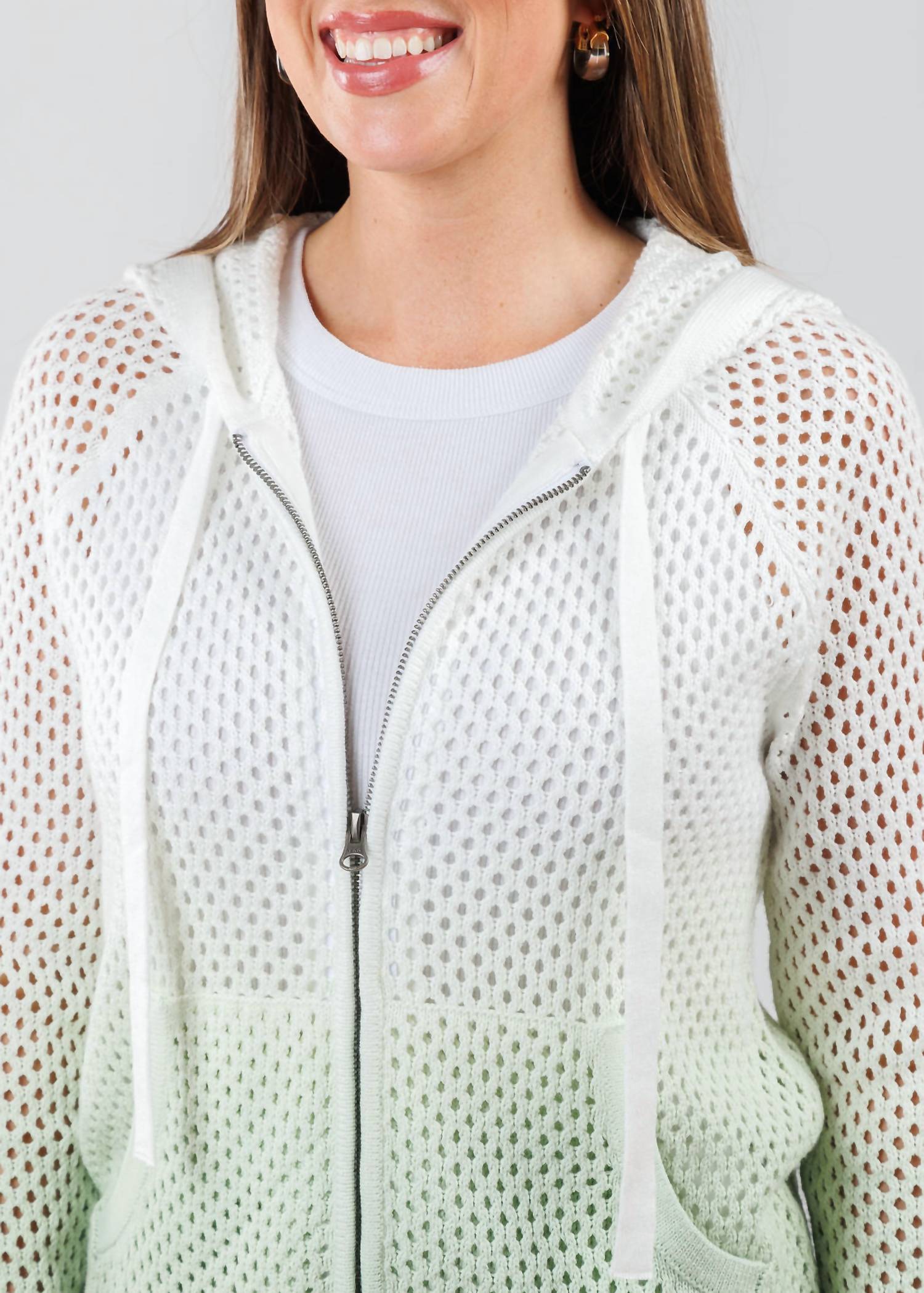 Introducing the JSS Knits Ombre Mesh Zip Hoodie, a spring essential for a laid-back vacation vibe. This women's hoodie features long sleeves and a breathable 100% cotton mesh knit in a serene sage ombre, effortlessly blending comfort with style. Designed with a full zip closure for easy layering and a relaxed fit, it's perfect for breezy mornings and sunset strolls. Model is wearing a size S and measures 5'6" in height with a 34" bust, 28.5" waist, and 31" hip.