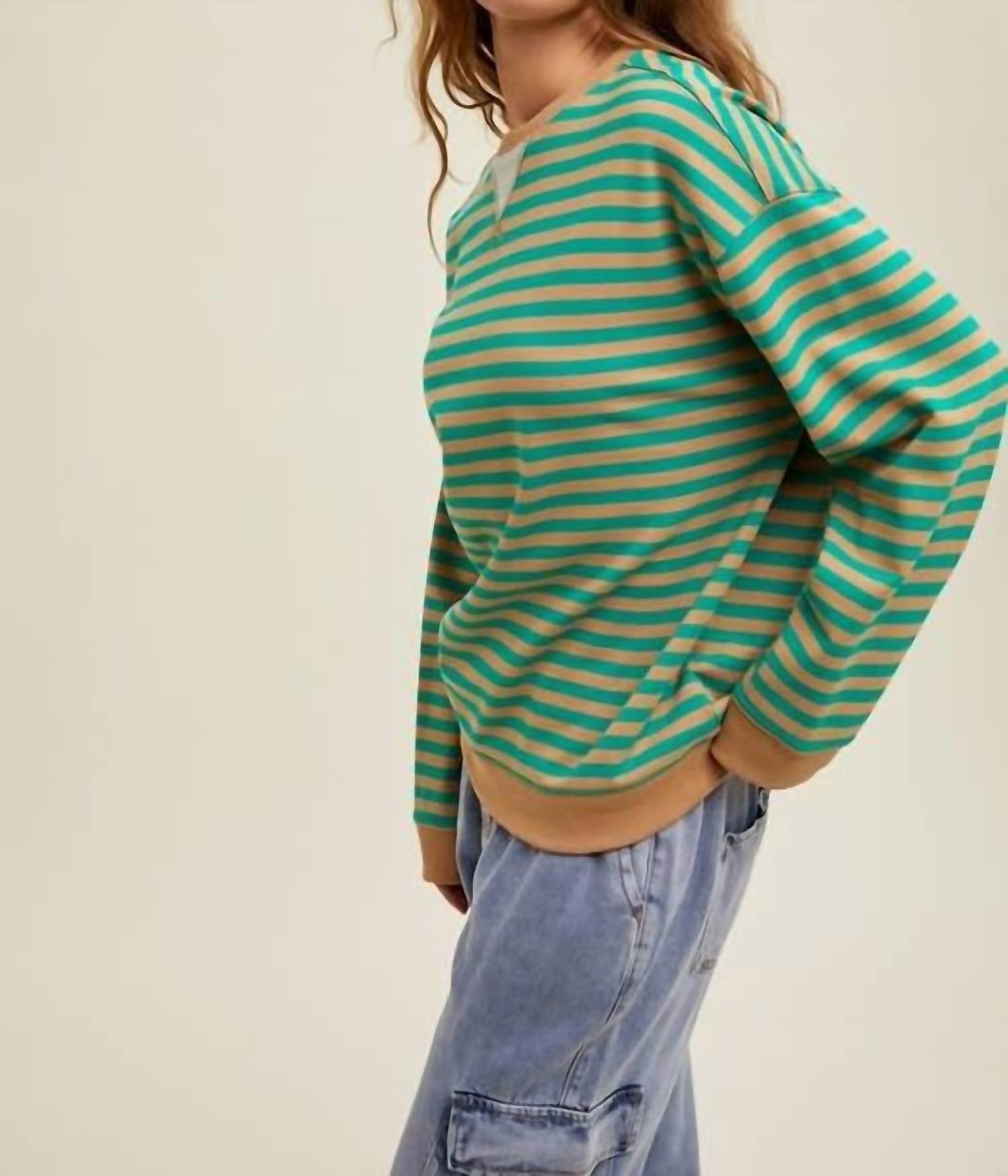 Cozy fabric, impeccable design - Meet the sweatshirt that you'll never want to take off. Elevate your travel wardrobe with the Striped Oversized Crewneck Pullover by Kissed Apparel, an effortlessly stylish choice in taupe and green for women. Featuring long sleeves and a classic crewneck, this sweatshirt is perfect for embracing the winter season with a touch of maximalist flair. Crafted from a comfortable cotton blend consisting of 50% cotton and 50% polyester, this pullover offers a relaxed yet chic silhouette. Closure: Pull-on style. Care: Hand wash only.