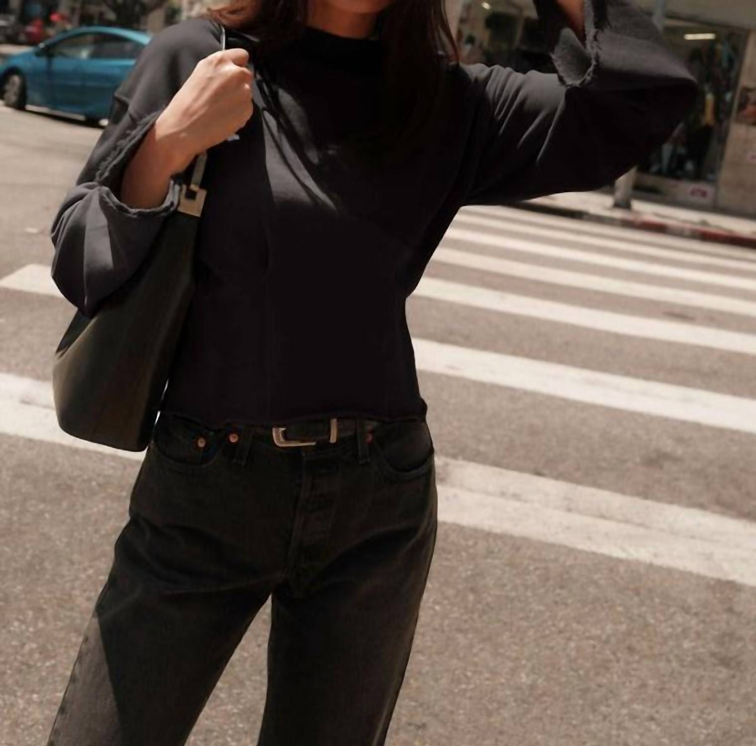 Introducing the Rocky Sweatshirt by Nation LTD, a chic addition in Jet Black perfect for your fall wardrobe. This sweatshirt features long bell sleeves, drop shoulders, and a mock neck with contrast ribbing, ideal for a minimalist, figure-flattering look. Made from 100% Peruvian Cotton, this piece is pull-on with signature corset seam details. Care is simple with machine wash and air or line dry to prevent any slight shrinking. Model Bex is 5'8.5" and wears a size S.