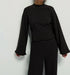 Introducing the Rocky Sweatshirt by Nation LTD, a chic addition in Jet Black perfect for your fall wardrobe. This sweatshirt features long bell sleeves, drop shoulders, and a mock neck with contrast ribbing, ideal for a minimalist, figure-flattering look. Made from 100% Peruvian Cotton, this piece is pull-on with signature corset seam details. Care is simple with machine wash and air or line dry to prevent any slight shrinking. Model Bex is 5'8.5" and wears a size S.