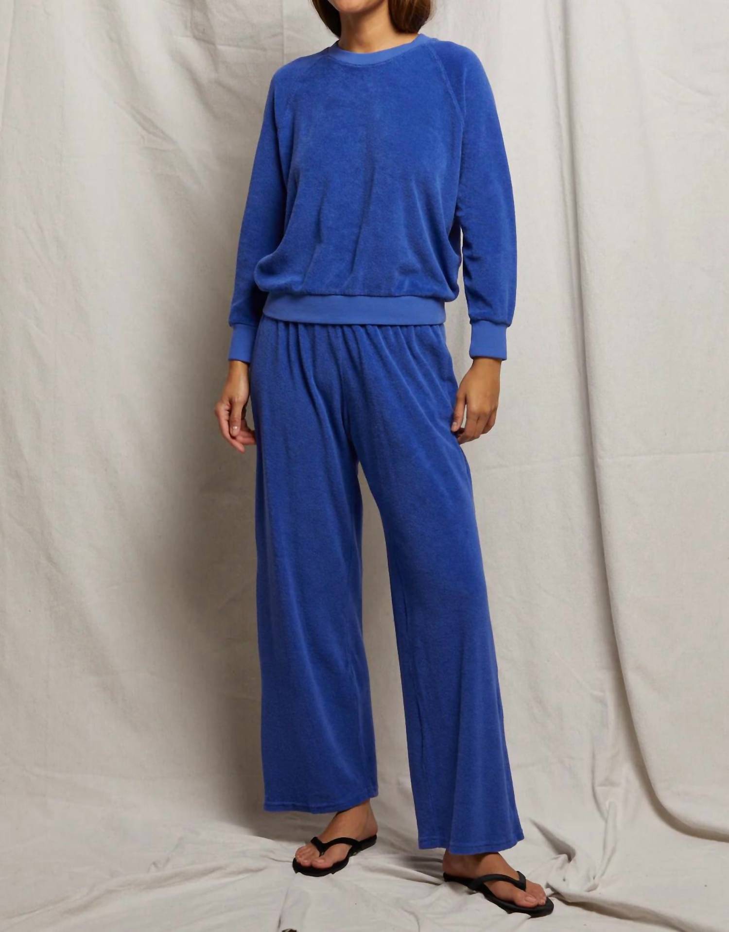 Introducing the Saylor Terry Sweatshirt by perfectwhitetee, a relaxed piece in vibrant Violet Blue designed for casual comfort and style. Featuring varsity-style raglan shoulders with long sleeves, this sporty sweatshirt is crafted from 100% cotton in medium-weight French terry fabric. Made in the USA, its pull-on closure adds to the easy, laid-back vibe perfect for a 90s fashion trend. Care instructions include hand washing with cold water, making it a practical addition to any fall wardrobe.