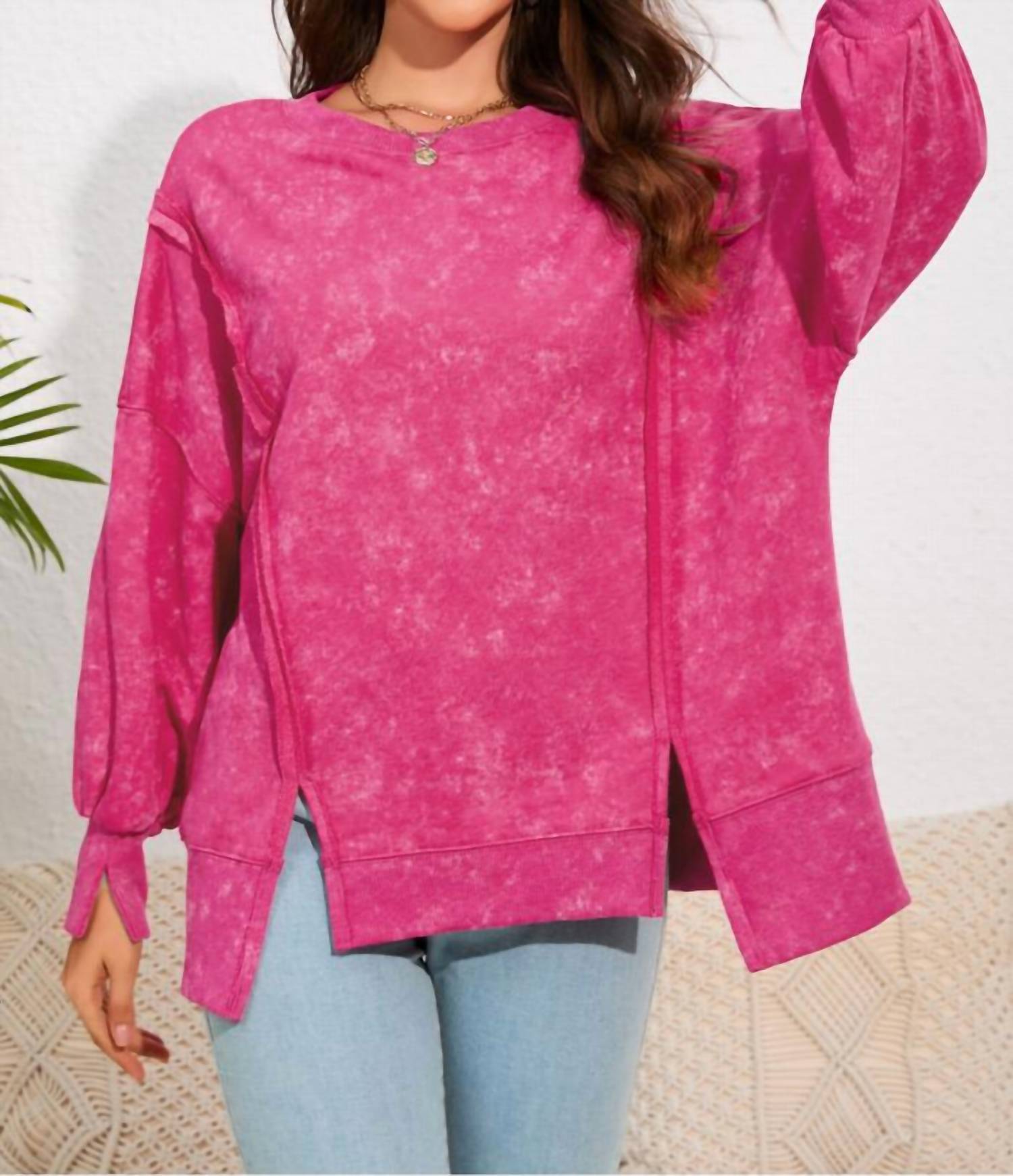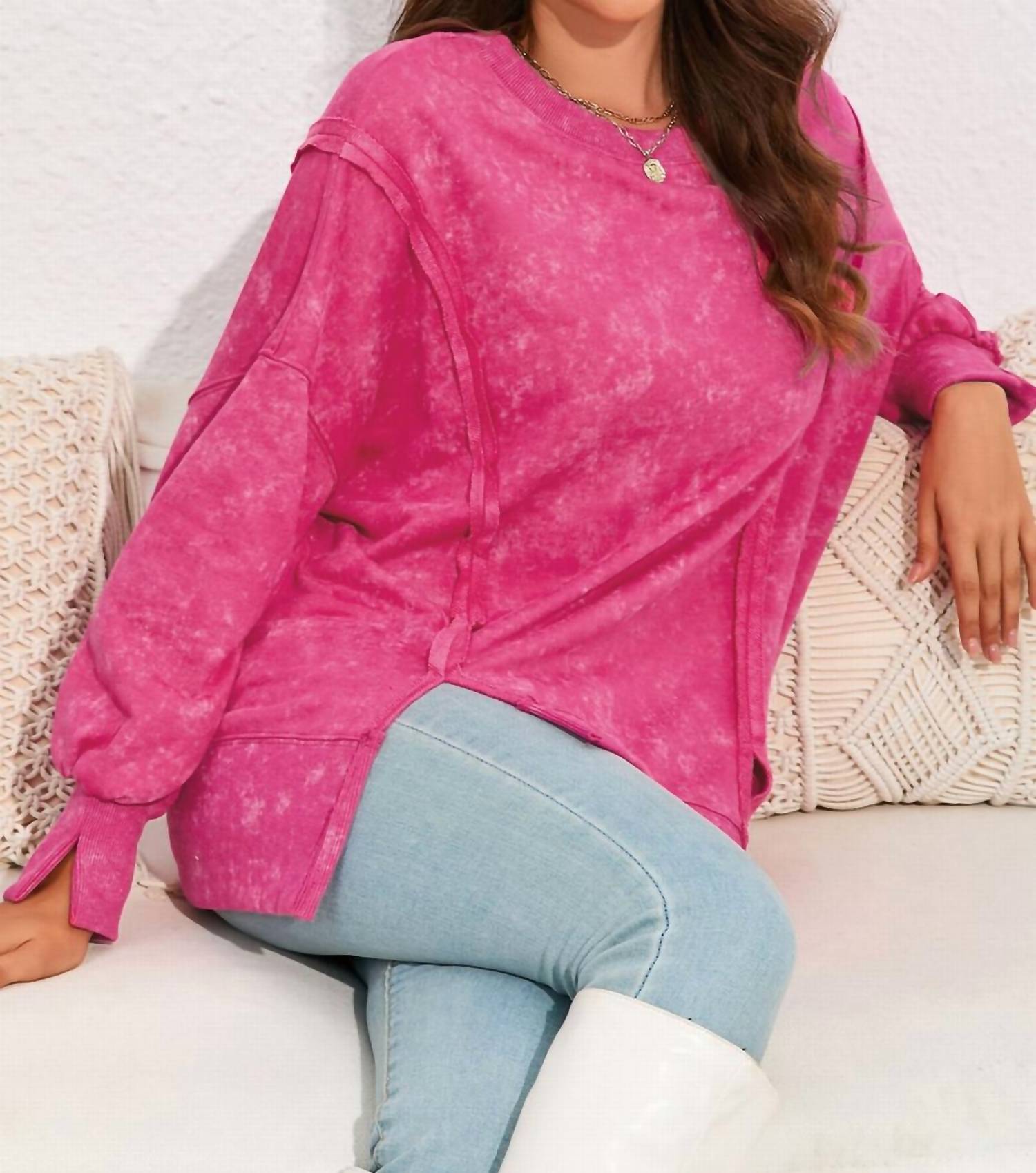Elevate your casual wardrobe with the Acid Wash Relaxed Fit Seamed Pullover Sweatshirt by Shiying Fashion. Designed in a vibrant Rose hue with a trendy tie-dye pattern, this long sleeve sweatshirt features the comfort of a cotton blend, composed of 80% polyester and 20% cotton. The pull-on closure and stylish seamed details, coupled with slits for added movement, make it a perfect choice for a music festival. Available in sizes S to XL, with bust measurements ranging from 52" to 62" and lengths from 25.5" to 28".