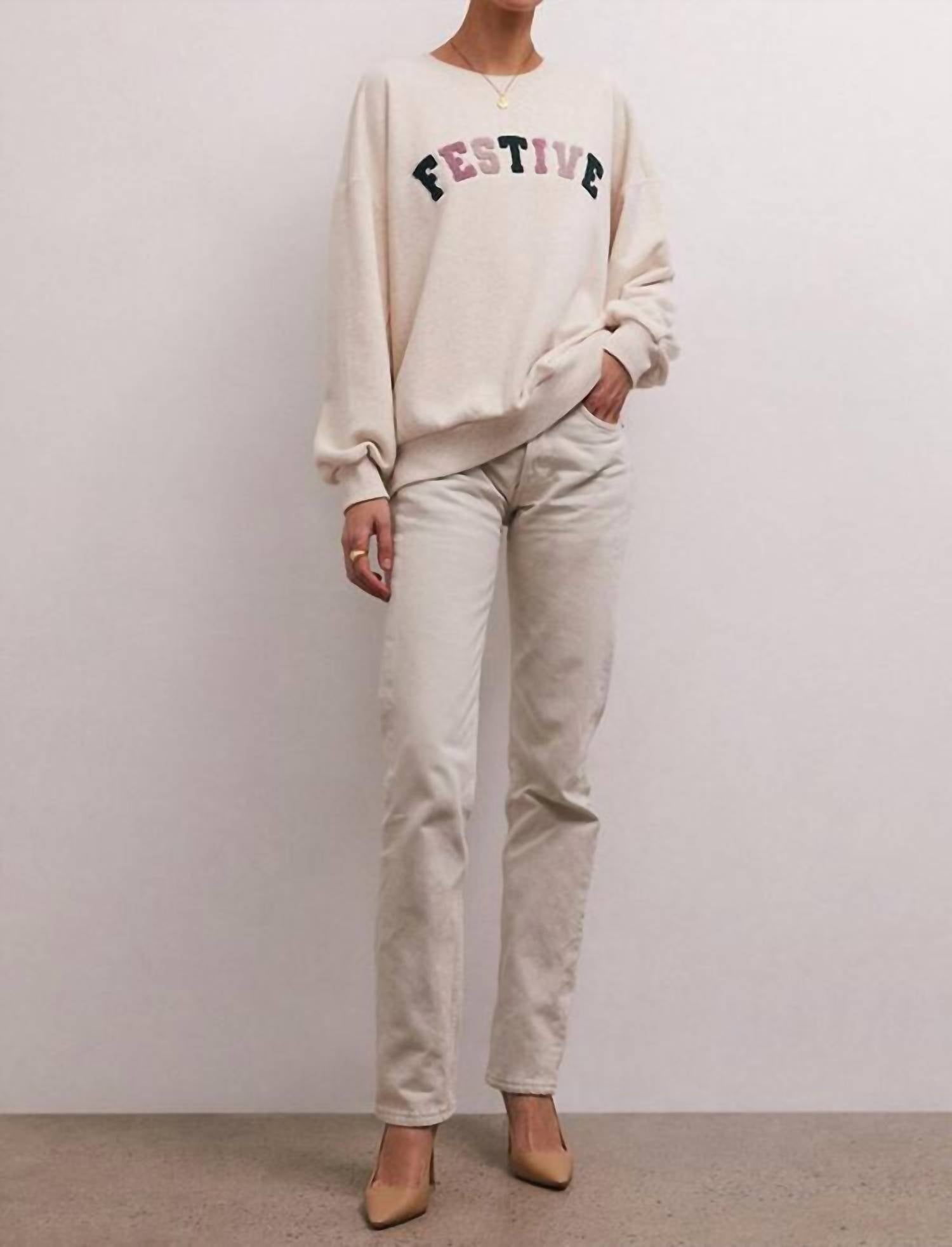 Este pulôver descontraído apresenta a palavra "festive" (festivo) na frente, bordada em chenille multicolorido. Caimento oversized. Moletom com gola redonda. 68% algodão, 17% poliéster e 15% rayon. Tamanho real. Lavar à mão com água fria e pendurar para secar.