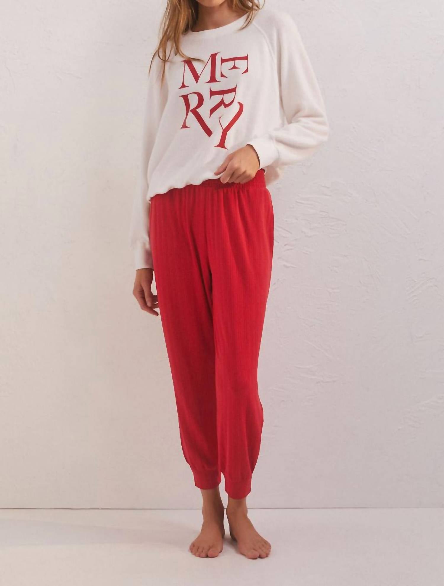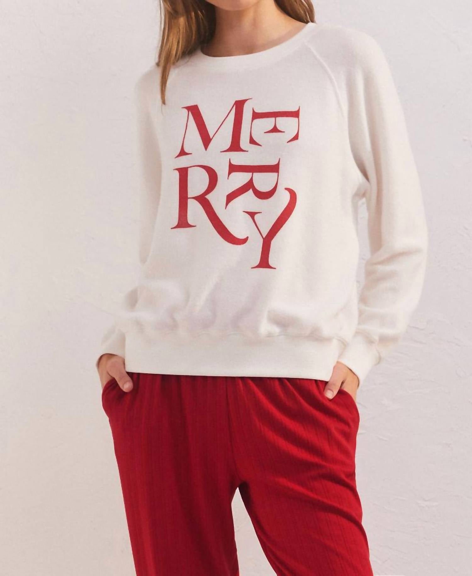 A blusa de manga comprida Cassie Merry da Z Supply é uma adição encantadora ao seu guarda-roupa de inverno, confeccionada em malha macia e escovada Dream Cozy. Composta por 60% rayon, 37% poliéster e 3% elastano, esta blusa descontraída e semitransparente apresenta uma estampa serigrafada festiva "Merry" e acabamento canelado. Este moletom com capuz possui um design clássico de gola redonda e está disponível na cor branca. Para cuidar desta peça, lave-a com água fria e seque-a em temperatura baixa.