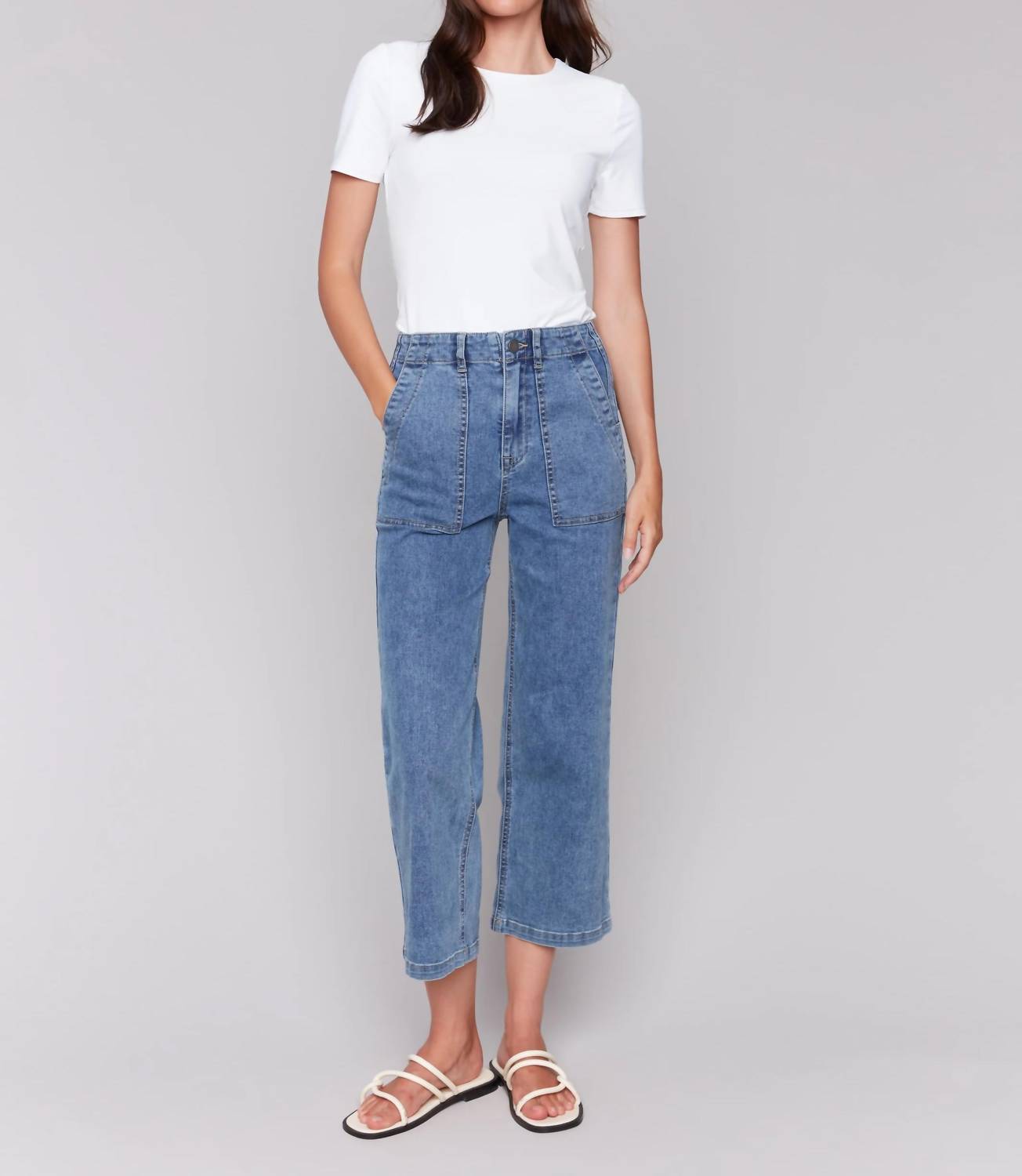 The perfect cropped jean for those transitional seasons. Elevate your casual wardrobe with the Cropped Utility Pocket Jean by CHARLIE B, crafted for style and comfort in Blue Moyen. Featuring a cropped length and regular fit, these jeans are intelligently constructed from stretch denim, composed of 76% cotton, 23% polyester, and 1% spandex. Designed with a high rise and straight leg style, they ensure a flattering fit with utility style pockets and a medium wash finish. Closure: Zip closure. Care: Machine wash and line dry. The inseam measures 26 inches, providing a trendy, versatile addition to your spring collection suitable for any travel occasion.