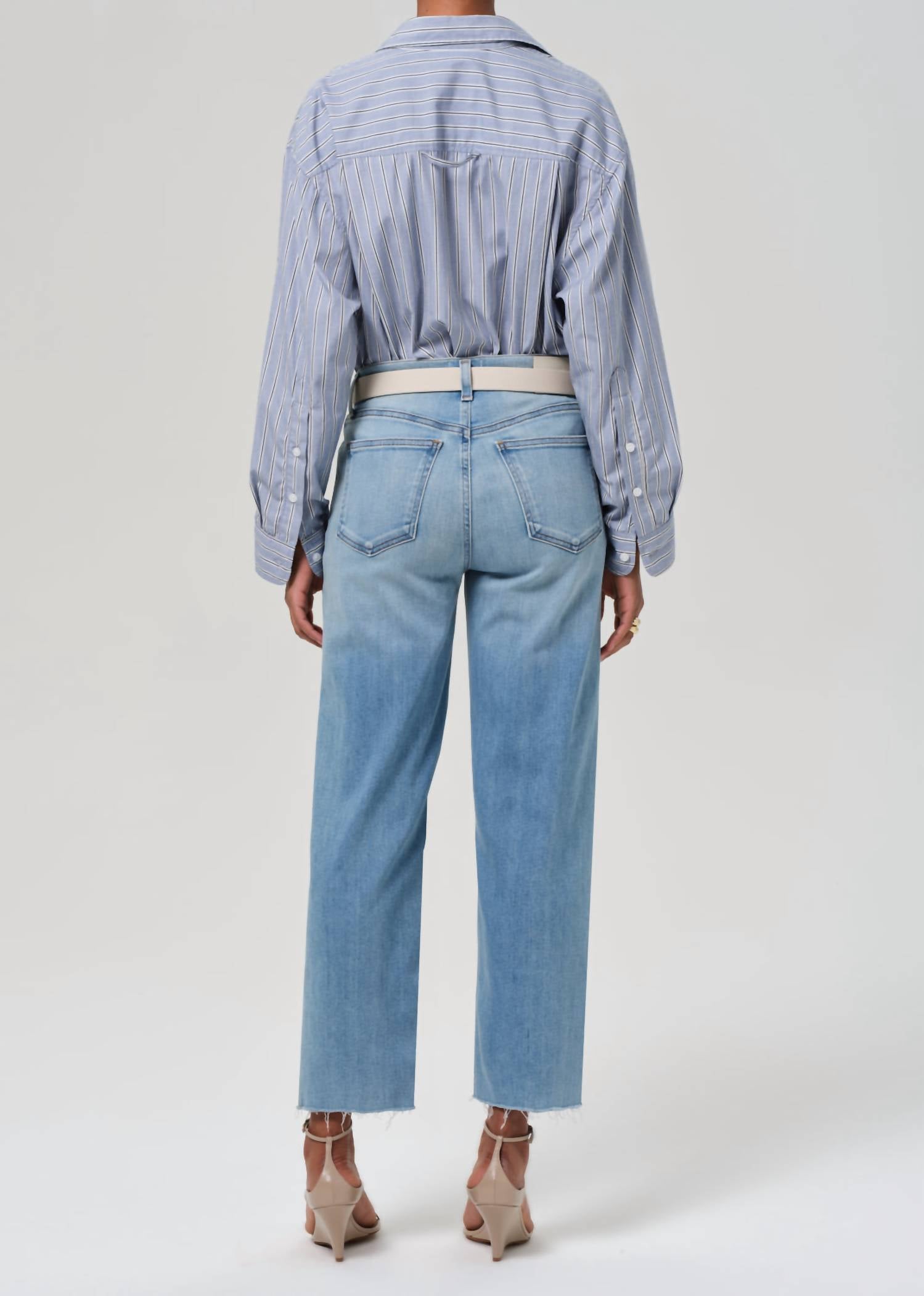 Discover the Palma High Waist Raw Hem Straight Leg Jeans by Citizens of Humanity, an essential addition to your wardrobe in the Lisbon color. Crafted from a blend of 81% Regenerative Cotton, 11% Lyocell, 6% Elastomultister, and 2% Elastane, these jeans offer a soft stretch denim feel while holding their shape all day. With a high-rise of 11 inches and a 27-inch inseam, they feature a relaxed straight leg fit and a leg opening of 17 inches, tailored with a button closure and zip fly. For your convenience, these jeans are machine washable and can be tumble dried, ideal for summer vacations or a Mother's Day gift.