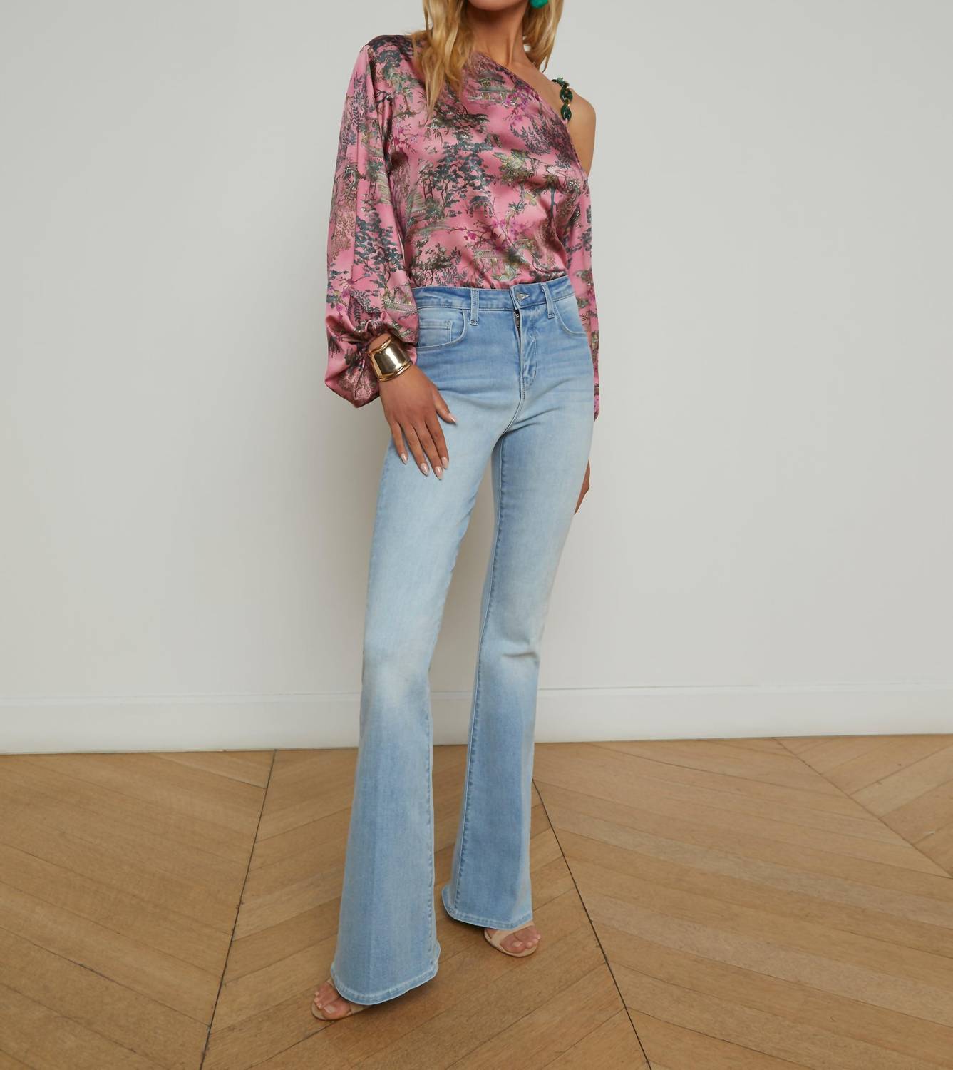 Just as cute as they are comfortable. Embrace vintage flair with the Marty Flare Jeans by L'Agence, designed in a solid Dorian hue for a chic look. These women's jeans feature a high-rise and flared leg in a light wash, complete with a button and zip fly closure, exuding timeless elegance. The cotton blend composition offers a comfortable fit: 73% cotton, 25% Repreve polyester, 2% spandex. Care instructions include machine wash and tumble dry, making them as practical as they are stylish. With an inseam of 35 inches and a 10-inch rise, these jeans provide a beautifully proportioned fit perfect for your travel and Valentine’s Day plans.