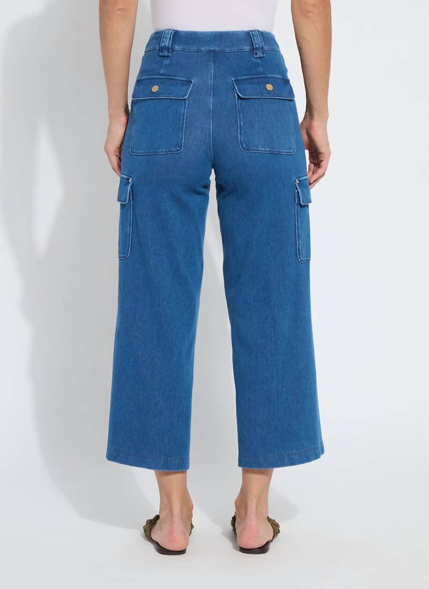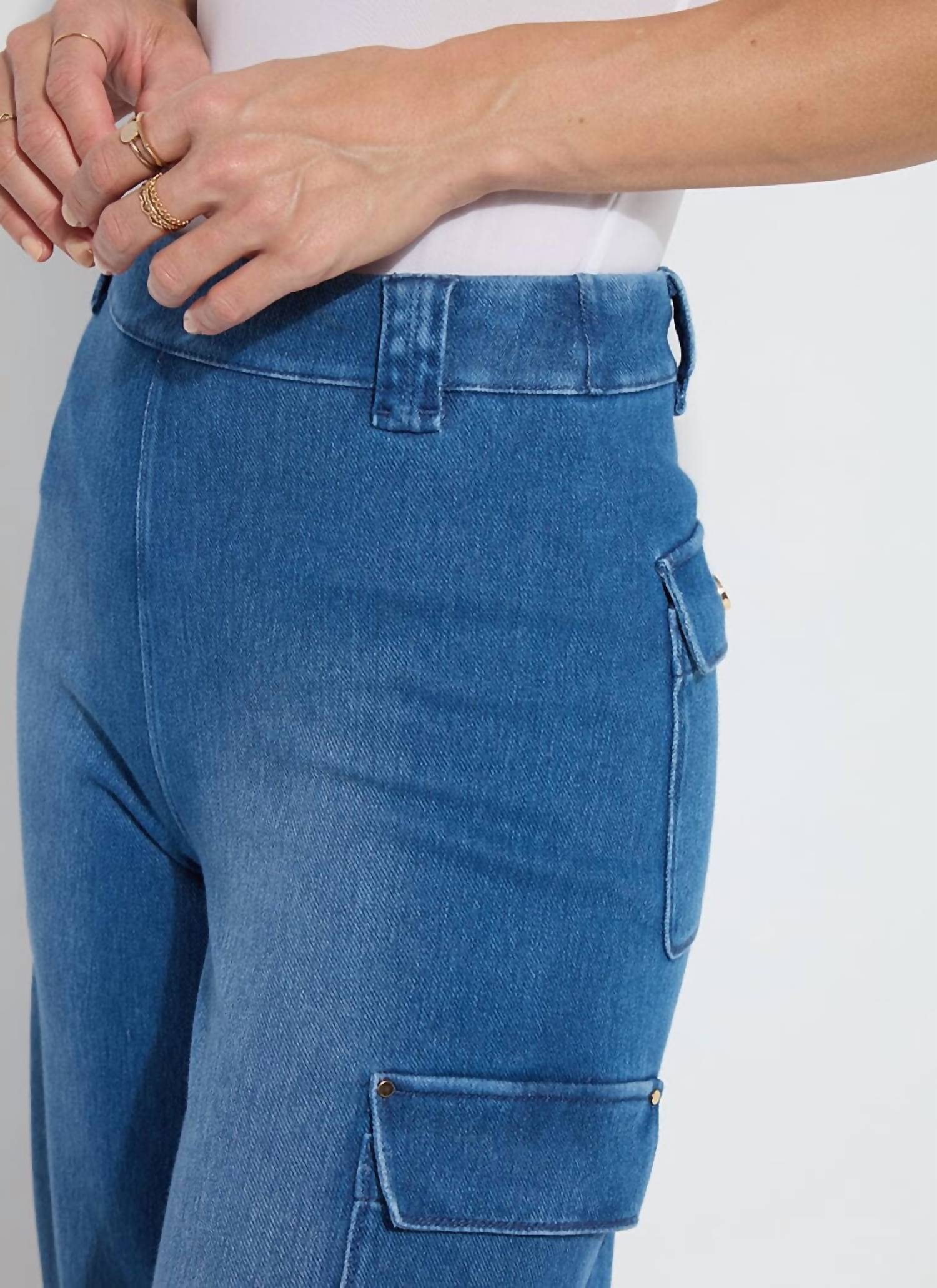 Pair these wide leg jeans with mules, slides or your favorite strappy sandals. Introducing the Erin West Utility Wide Leg Crop Jeans by Lysse in a stylish mid-wash. These high-waisted jeans, crafted from a knit denim blend of 95% cotton and 5% spandex, feature full-length wide legs that offer both comfort and style. Designed with a concealed patented 360° smoothing waistband, they boast back patch pockets with light gold snaps, cargo pockets with rivets and flaps, and a button closure. For easy maintenance, machine wash and line dry. Model is 5'10" and wears a size S.