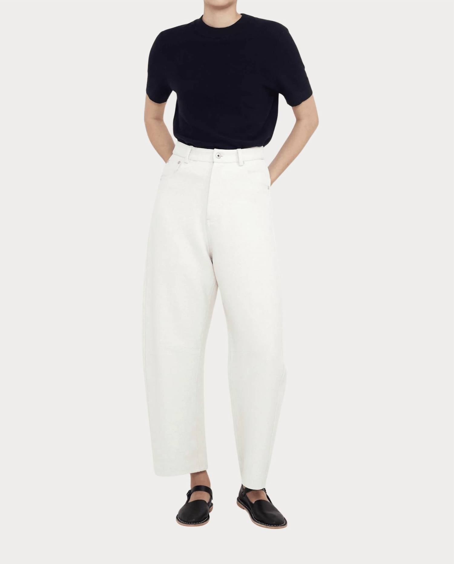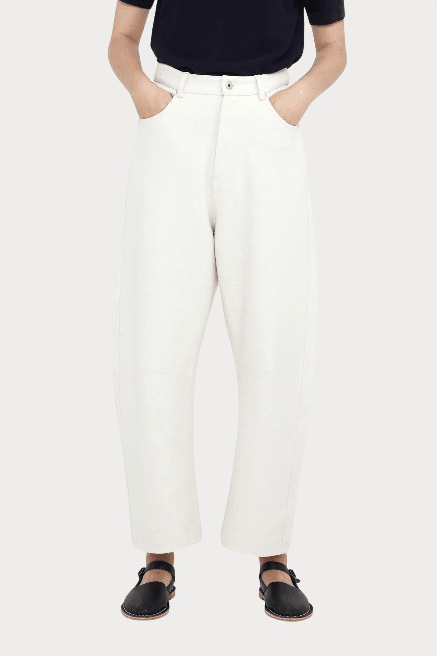 Introducing the Relaxed Curve Legged Trouser in Off-White by 7115 by Szeki, a perfect minimalist piece for your wardrobe. Featuring a relaxed fit, these trousers boast a pronounced curved leg silhouette and an extended rise, allowing for versatile styling at either mid or high waist. Crafted from 100% cotton, they come equipped with a practical button fly closure and belt loops for functionality. Made in Guangzhou City, China, these trousers can be maintained with either hand or machine wash cold and should be dried flat or dry cleaned.