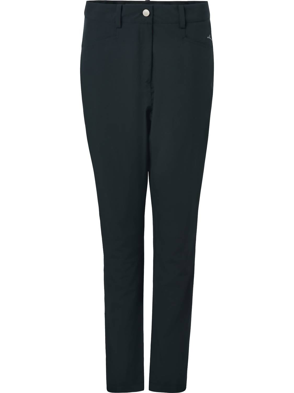Experience comfort and style with the Women's Links Warm Waterproof Trousers by Abacus Sportswear US in classic black. These trousers are crafted with a waterproof, breathable fabric offering 2-way stretch, and feature a zip closure. Designed for practical wear, they come with an elasticated back at the waist, straight leg, and pockets both at the front and back. Care instructions: machine wash and line dry. Perfect for a rainy day on the golf course or a casual walk in the woods, these trousers ensure warmth with their brushed tricot lining.