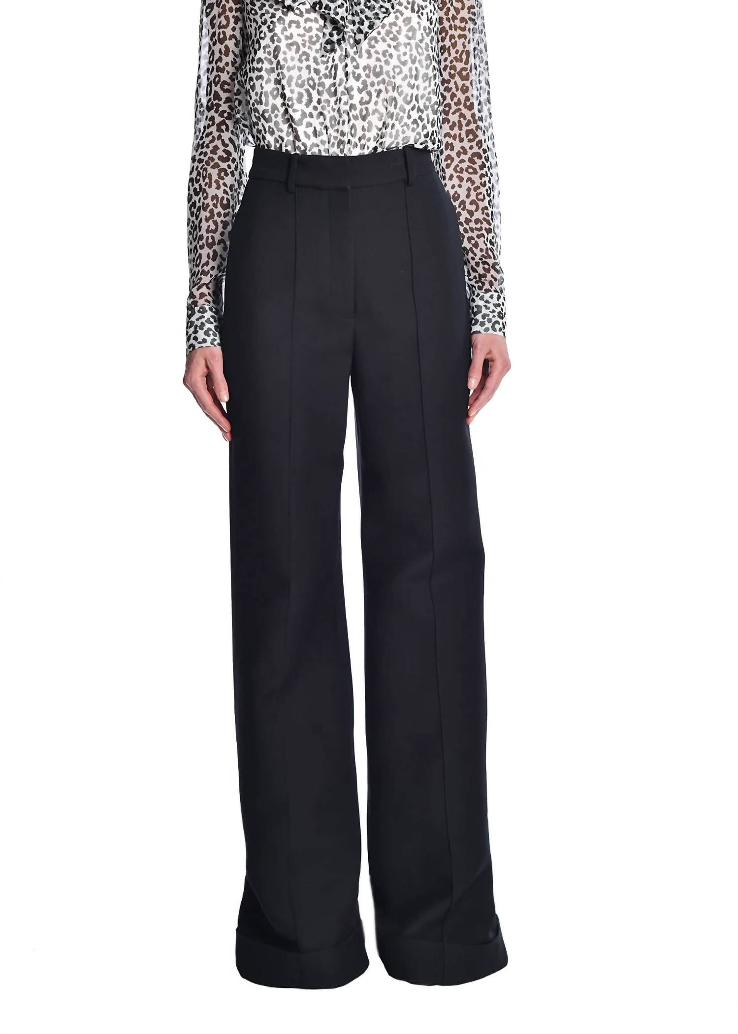 Elevate your workwear wardrobe with the Silk Wool Cuffed Hem Wide Leg Trouser by Adam Lippes, crafted in luxurious Italian Silk Wool. These black, solid, wide-leg trousers feature a relaxed fit with a high-rise waist and an elongating pin-tuck front, complete with pockets for added functionality. Made in New York City, they offer a zip closure and a cuffed ankle for a polished finish. Composition: 77% Wool, 23% Silk. Care: Dry clean only, line dry.