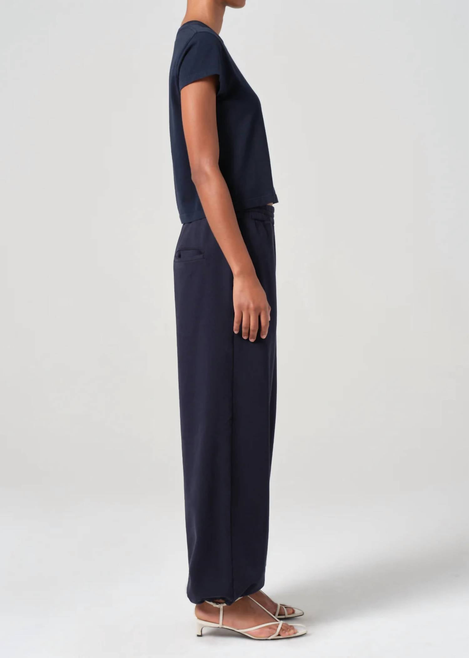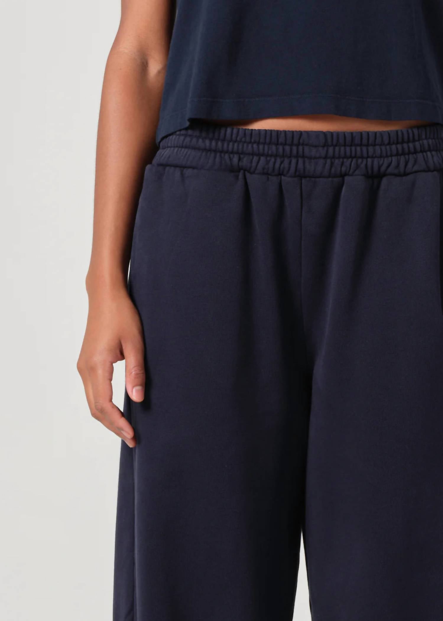 The perfect pant for running around town and looking cool while doing it. Introducing the Elliott Wide Leg Sweatpants by AGOLDE, your go-to for streetwear elegance. These sweatpants boast a relaxed fit with wide legs and a slouchy silhouette, complete with an elastic waistband for ease. Crafted from 100% cotton, they offer a luxurious feel and come in a striking Mirage Navy color. Closure: Pull-on style. Care: Machine wash and tumble dry for effortless maintenance. Whether on the go or lounging, these sweatpants deliver both style and comfort.