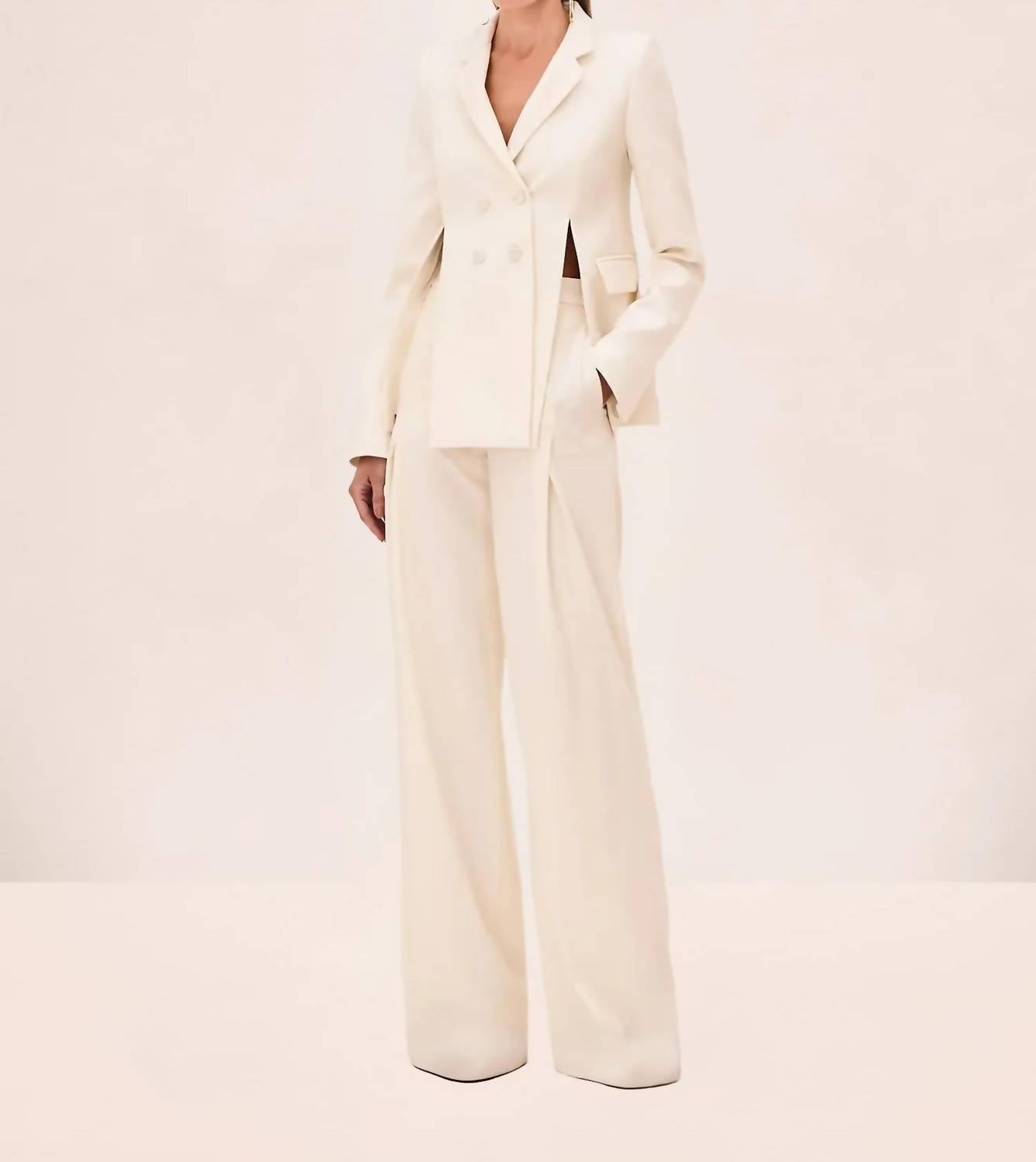 Elevate your evening event wardrobe with the Jude Pant by ALEXIS, a sophisticated addition in ivory. Designed with a high-rise waist, these classic fit trousers feature wide legs and a tailored waistband with pressed front seams to accentuate elegance. The inclusion of pockets adds functionality to this chic piece. Though devoid of specified wash care instructions, attention to garment care will ensure longevity. Model is 5'10" with a 34B bust, 25" waist, and 35" hips, wearing an XS.