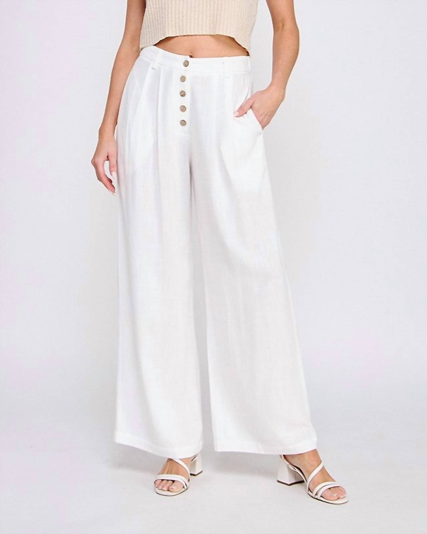 Elevate your holiday style with the Yacht Cruise Pants by ALLIE ROSE, perfect for a chic and effortless summer look. These white wide-leg pants are crafted from soft linen, offering comfort and sophistication. Designed with a high rise and elastic back, they ensure a comfortable fit with a stylish coconut button closure. Ideal for a holiday party or a minimalist summer look, these pants are the perfect staple for your wardrobe.