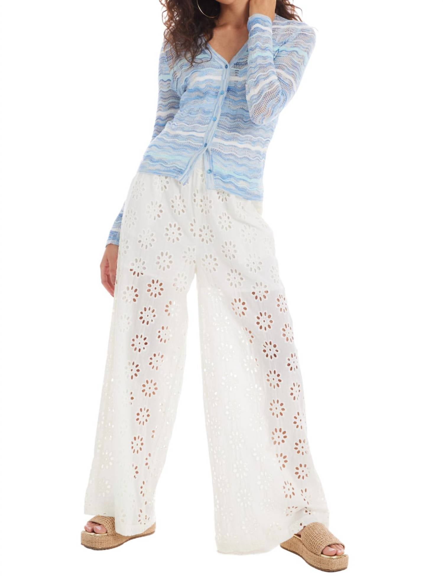 Embrace effortless elegance with the Penelope Pants by ALLISON NEW YORK, perfect for transitioning from the beach to sunset cocktails. These ivory wide-leg pants are crafted from floral eyelet cotton, showcasing a loose and flowy fit with a convenient pull-on elastic waistband. Complemented by practical pockets, they offer an inseam of 30 inches, ideal for a boho chic vibe. Care for these essentials by adhering to dry clean instructions. 100% Cotton.