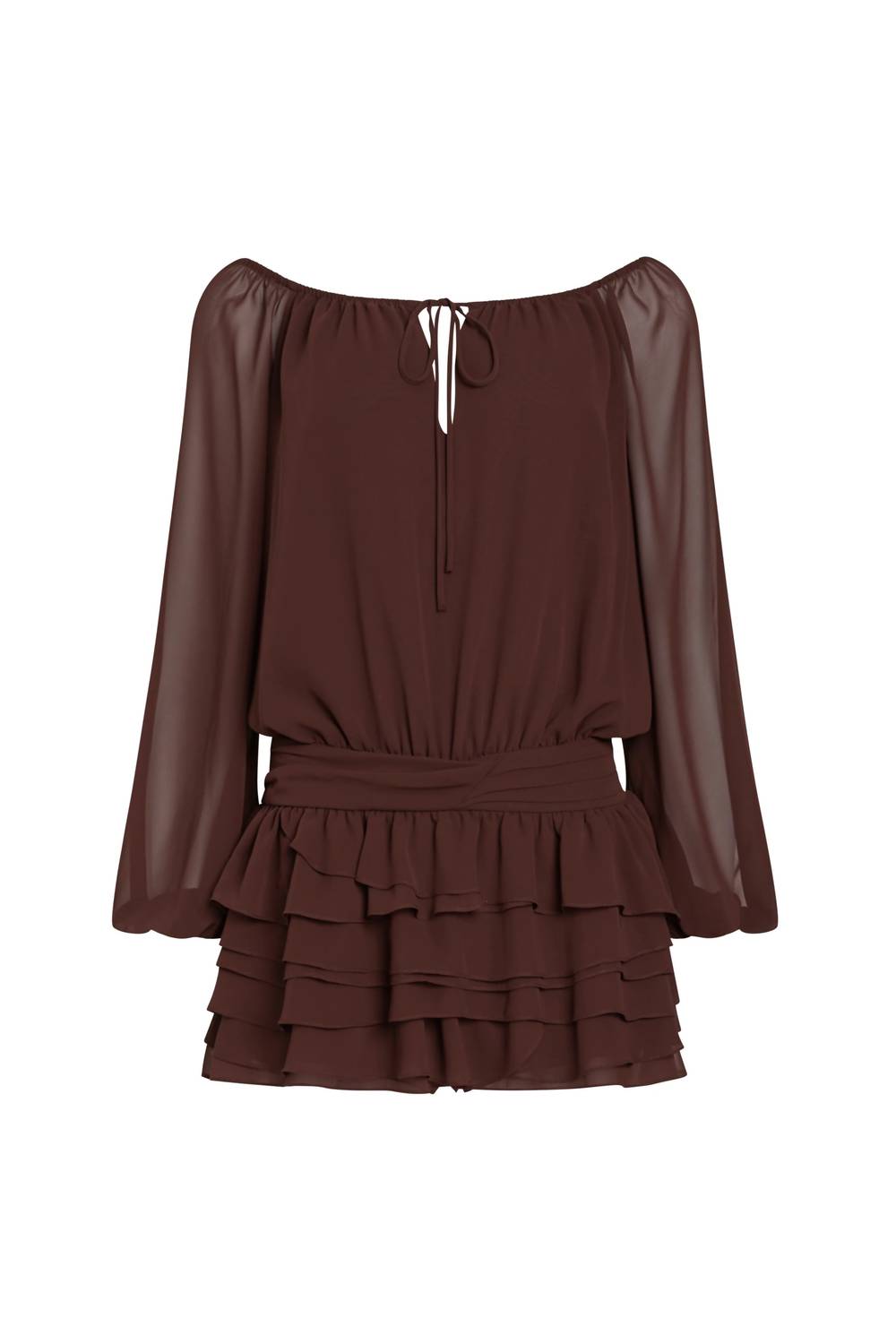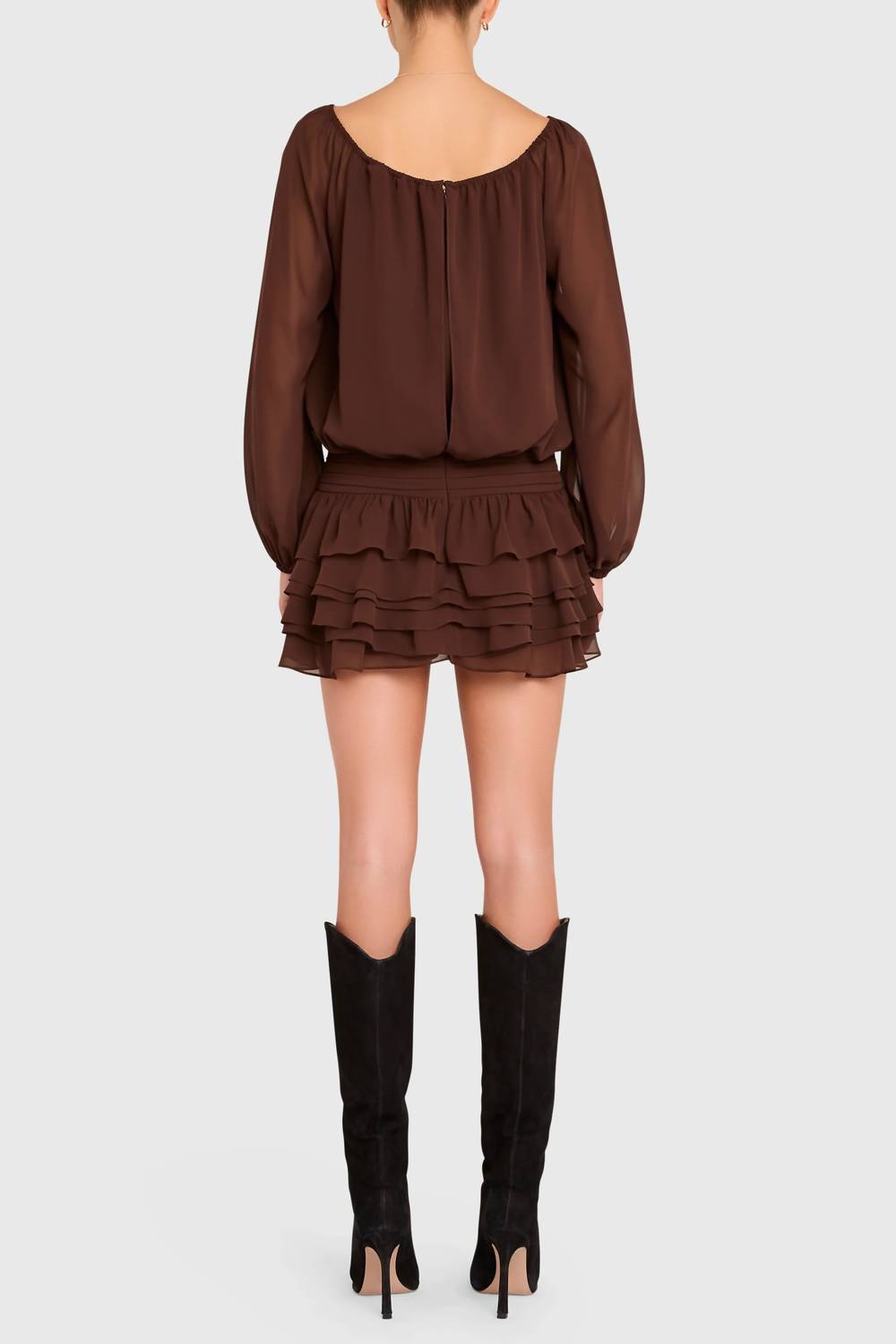 Embrace the chic charm of the Dallas Skort Romper by Amanda Uprichard in a rich Cocoa hue, perfect for any dinner party. This stylish number boasts long sleeves and a scoop neck with elastic and a self-tie at the center front chest. Made from 100% Viscose with a Polyester lining, the romper features a dropped waist with a ruffle skirt and pleated detail, complemented by self shorts underneath. Finished with a center back zipper for a seamless look, this fully lined piece requires dry cleaning to maintain its elegant appeal.