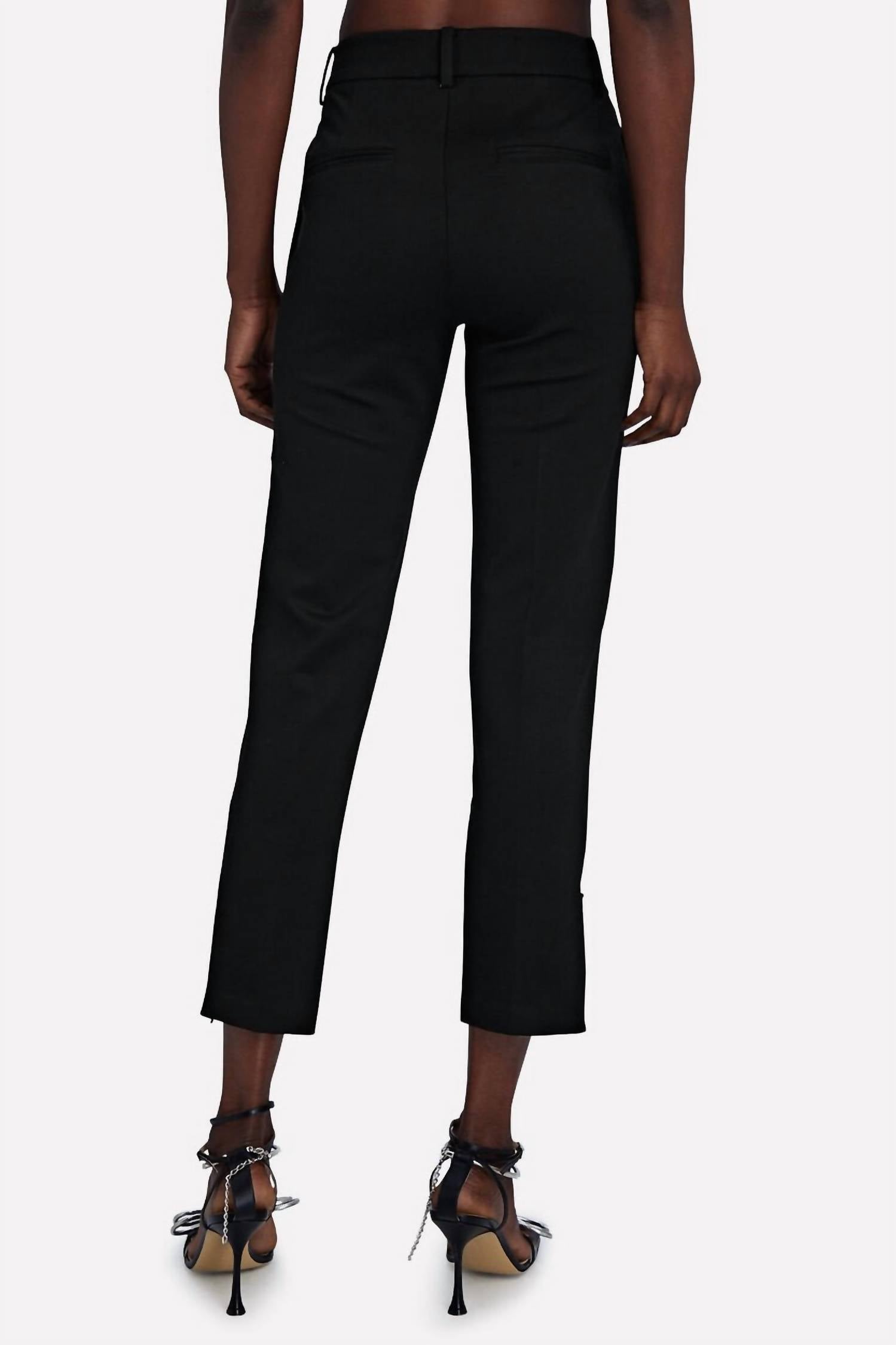 The Ian Slim-leg Pant by ANINE BING is an elegant addition to any wardrobe, presenting a refined Scandinavian aesthetic in smooth black ponte. Designed with a high-rise and slim fit, these pants feature a 10" rise and a 27" inseam, complete with belt loops and four-pocket styling for practicality. Composition includes 68% rayon, 25% polyamide, and 7% spandex, with a lining of 100% viscose, ensuring both style and comfort. Closure is managed via a zip fly and button closure, and the pants are machine washable for easy care. Imported and modeled in a size DK 34 by a model with height 5'10", bust 31", waist 24", and hips 34".