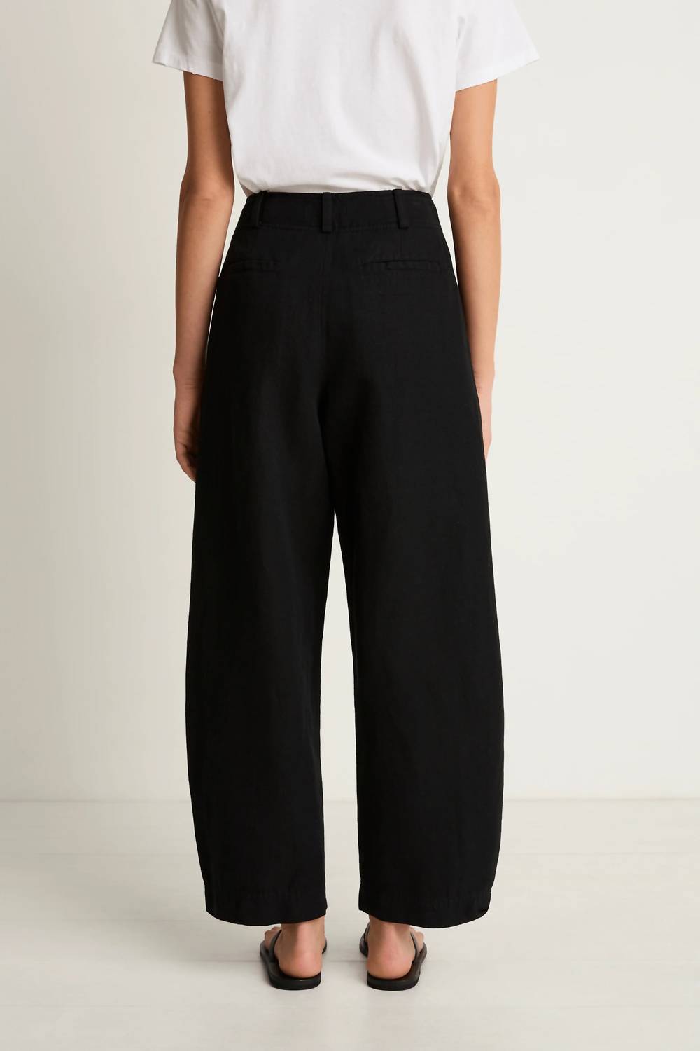 Upgrade your wardrobe with the Bari Crop Trouser by APIECE APART, a sophisticated choice for any occasion. These trousers feature a high-rise, cropped barrel leg design with a hook and bar zip closure, complemented by practical slant pockets. Composition: 60% Organic Cotton, 40% Linen. Care: Dry clean and lay flat to dry. Inseam measures 27 inches, making them a perfect fit for a minimalist spring look, ideal for a Thanksgiving dinner party.