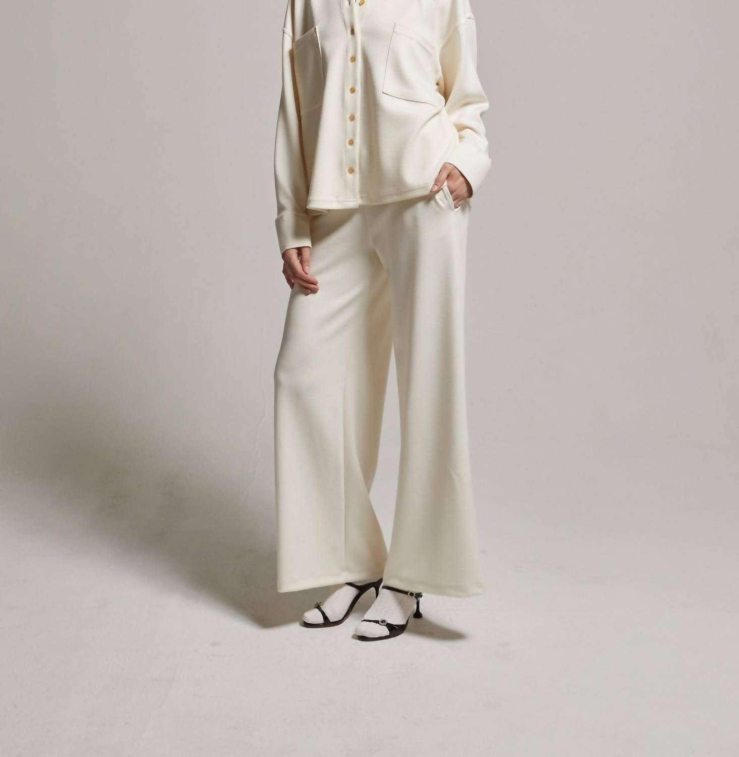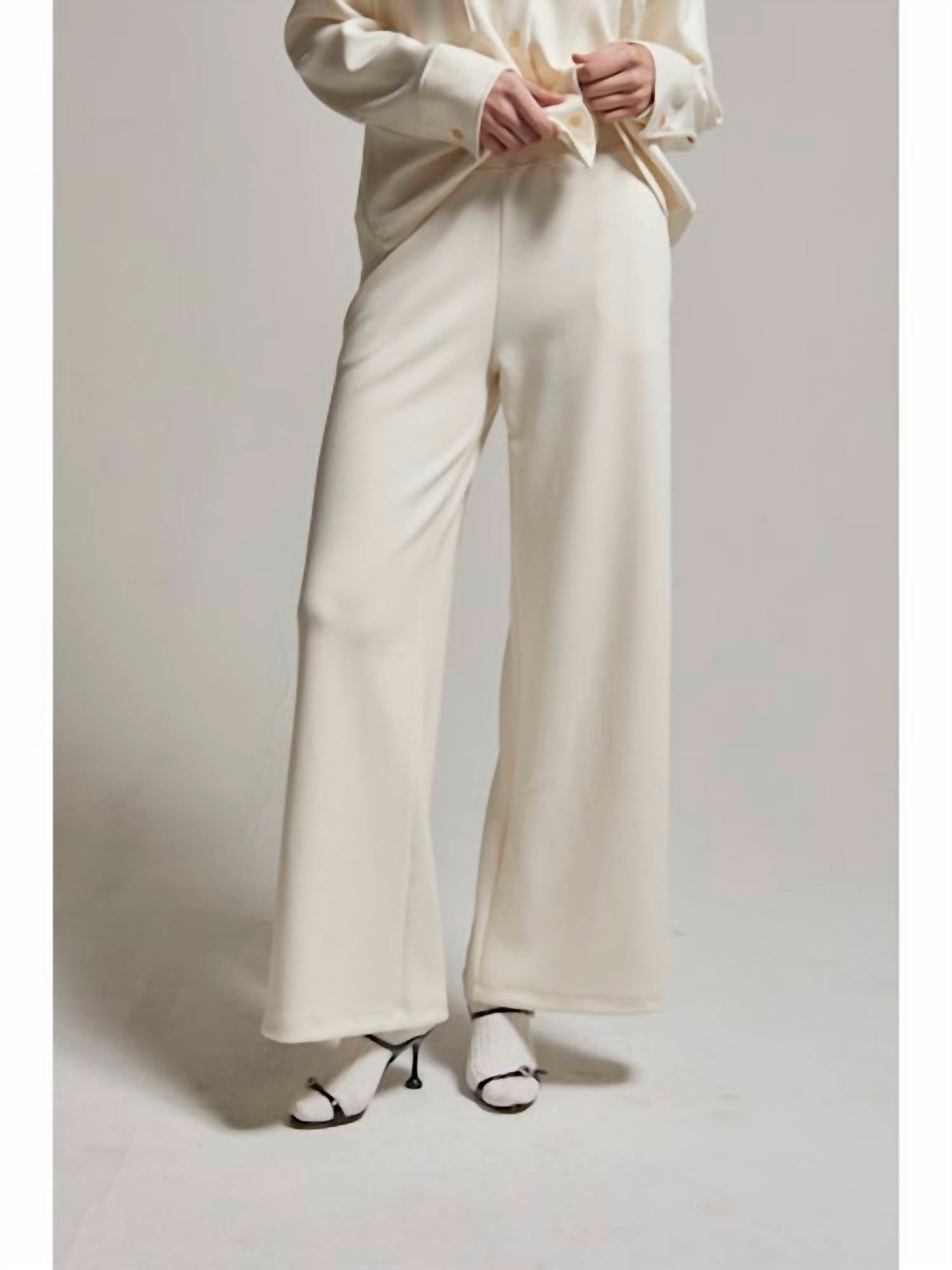 Experience effortless style with the Cassie Interlock Wide Leg Pants by Asher, tailored for chic comfort. Designed with a relaxed fit and high-rise waist, these pants feature a pull-on closure for easy wear. Crafted from a viscose blend of 48% Viscose, 48% Polyester, and 4% Spandex, they offer comfort and durability. Perfect for a spring holiday party, these solid black wide-leg pants come with pockets for practicality. Care: Hand wash and line dry to maintain their fit and quality.