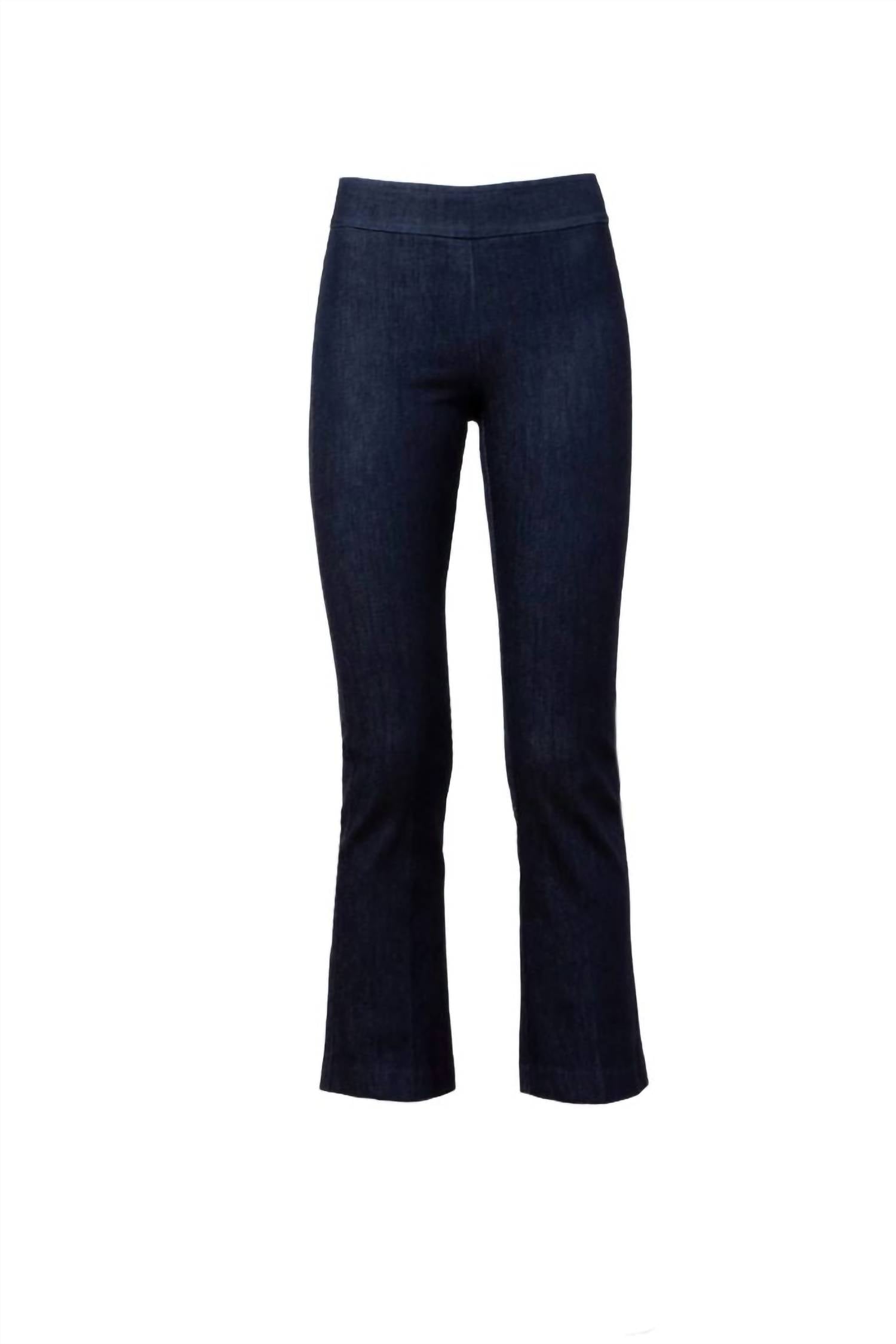 Discover the Leo Cropped Flare Pants by Avenue Montaigne, an elegant choice for your minimalist wardrobe. These high-rise, pull-on pants in dark denim flaunt a flared leg style and feature an elastic waistband for easy wear, with a cropped length boasting a 25" inseam and 10" rise. Crafted from a stretch denim composition composed of 88% cotton, 9% polyester, and 3% lycra, these pants are proudly made in the U.S.A. Maintain their sophistiquée look by hand washing them as instructed.