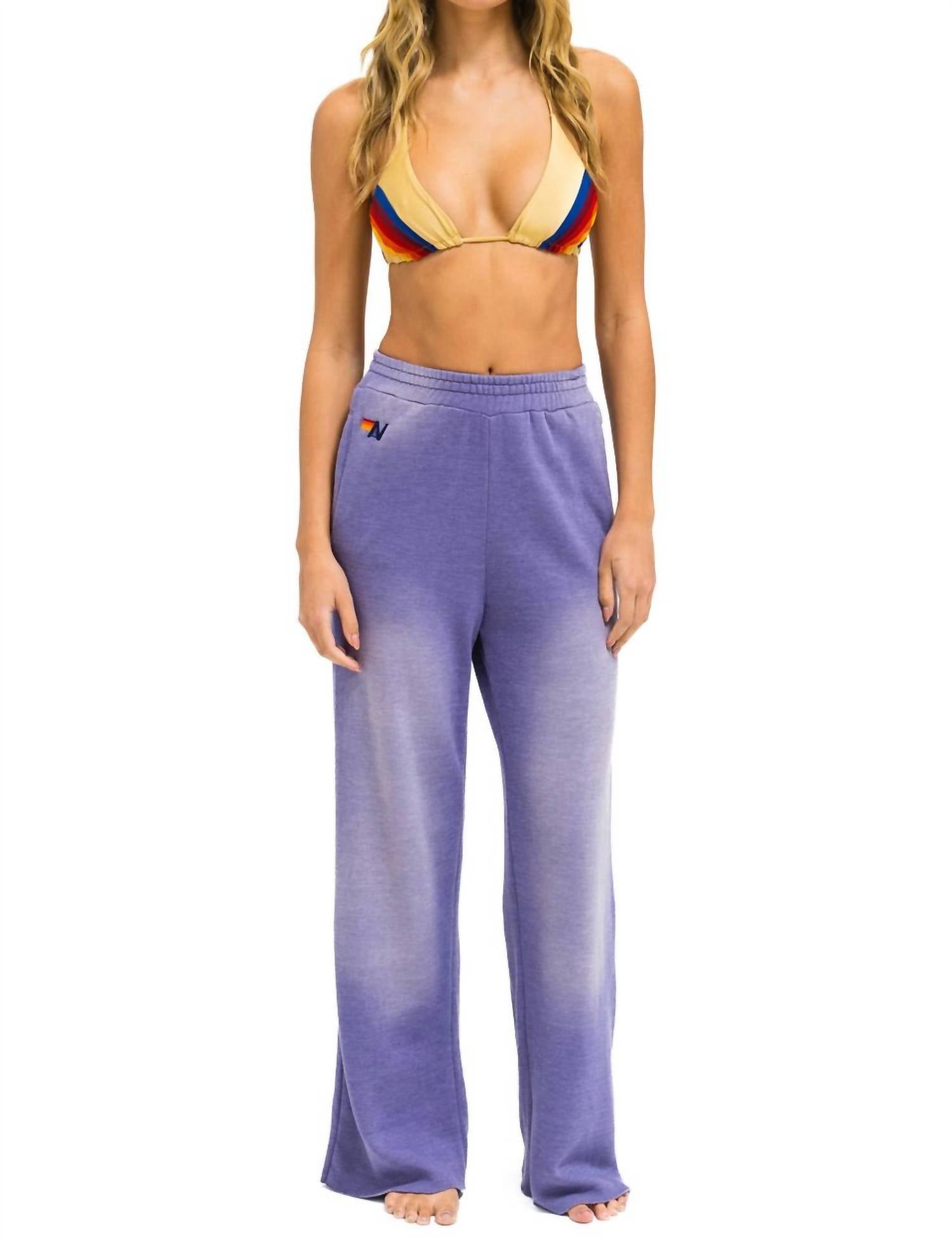 The perfect pant for running around town and looking cool while doing it. Experience unparalleled comfort with the Essential Wide Leg Pocket Sweatpants by AVIATOR NATION in a chic Faded Grape hue. Tailor-made with a luxurious tri-blend fabric composed of 50% polyester, 38% cotton, and 12% rayon, these sweatpants boast a wide leg style perfect for women seeking both style and comfort. Hand-sewn in Los Angeles, these track pants feature pockets and a convenient pull-on closure, making them a vacation-ready staple for casual, streetwear outings. Care is a breeze with machine wash and tumble dry instructions.