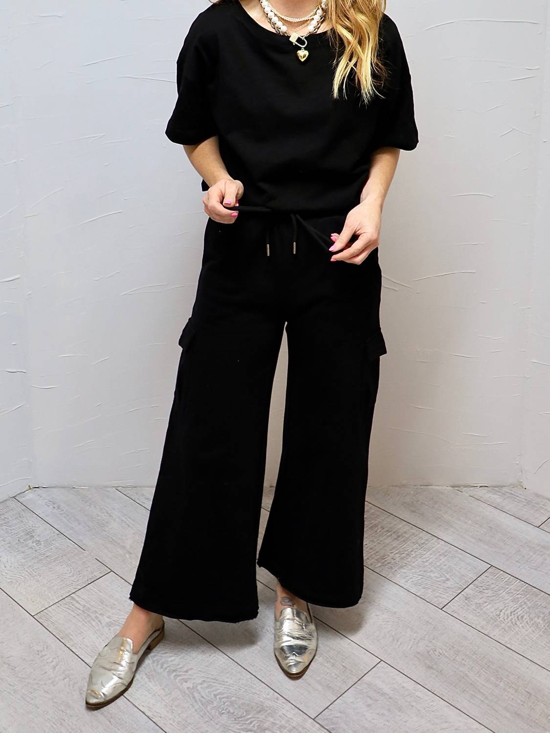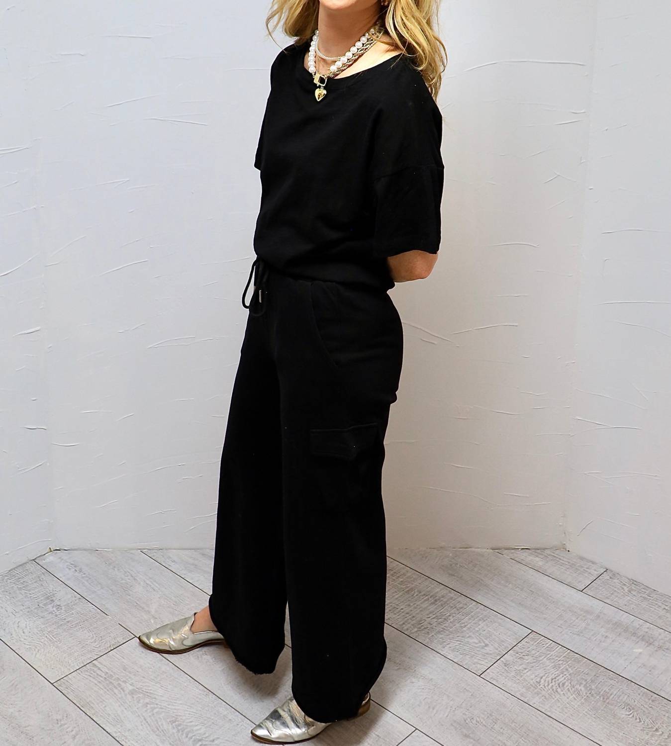 Apresentamos a Calça Let's Go Somewhere Bottom da Before You, perfeita para quem valoriza conforto e estilo. Com um prático fecho pull-on e um design de perna larga, esta calça proporciona um ajuste oversized que combina com qualquer ocasião. Confeccionada em 100% algodão com um toque de elastano no tecido contrastante para maior flexibilidade, ela vem equipada com práticos bolsos frontais inclinados para a frente e detalhes de bolso cargo. Eleve seu guarda-roupa com esta calça estilosa e versátil, disponível na cor preta clássica. Klarisa está vestindo tamanho pequeno.