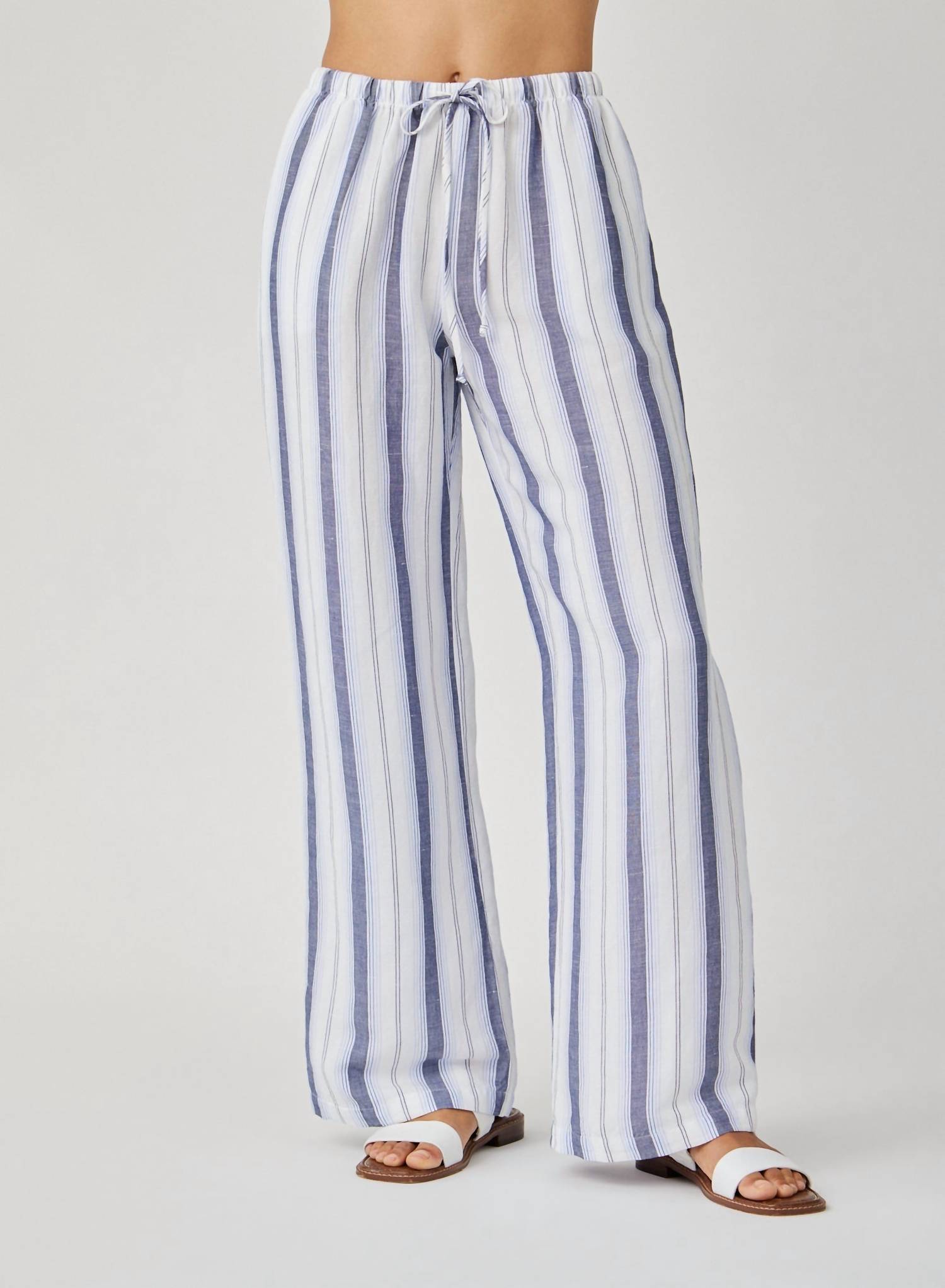 Introducing the Easy Wide Leg Pant by Bella Dahl, a boho chic essential with a Coastal Ombre Stripe pattern. These women's pants boast a wide leg silhouette with a mid-rise waist for a flattering fit, and come with the convenience of pockets. Crafted from a comfortable cotton blend, they feature a pull-on closure for ease of wear. Care instructions include machine wash and tumble dry friendly.