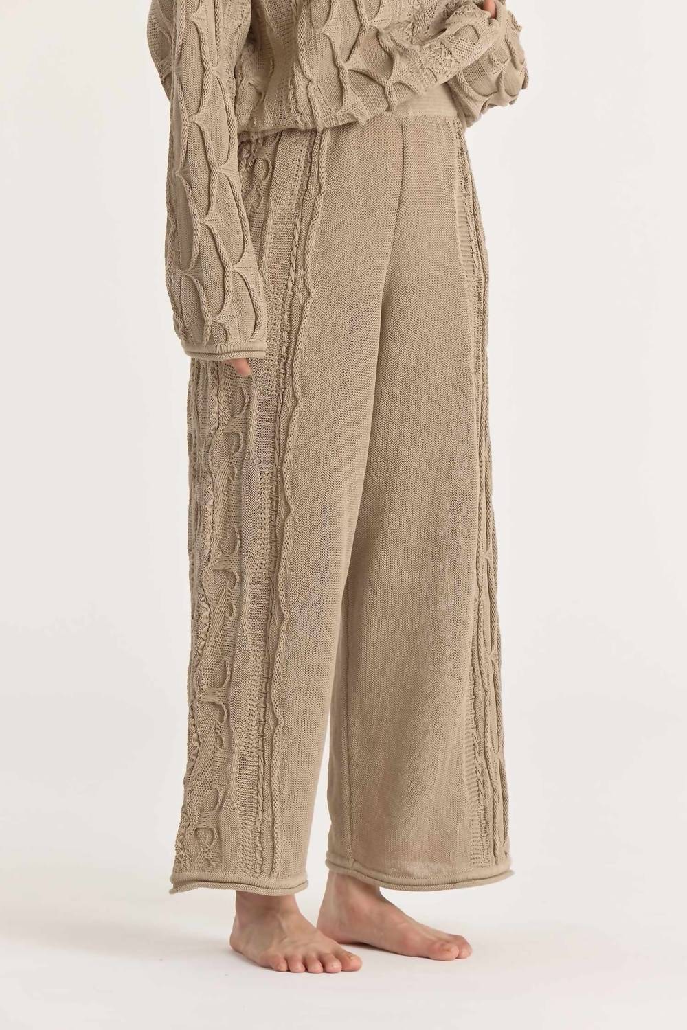 Discover the Cable Knit Pants in Taupe by Black Crane, exuding effortless elegance with a minimalist appeal. Crafted from 100% cotton, these wide-leg, high-rise trousers offer a relaxed fit and a uniquely textured, raised weave for distinctive style. Designed in Japan, they feature an elasticized waist and a dropped crotch, enhanced by rolled edge hem details. Please note these pants require dry cleaning, and the model is 5'6" wearing size S with measurements 32" chest, 24" waist, and 34" hip.