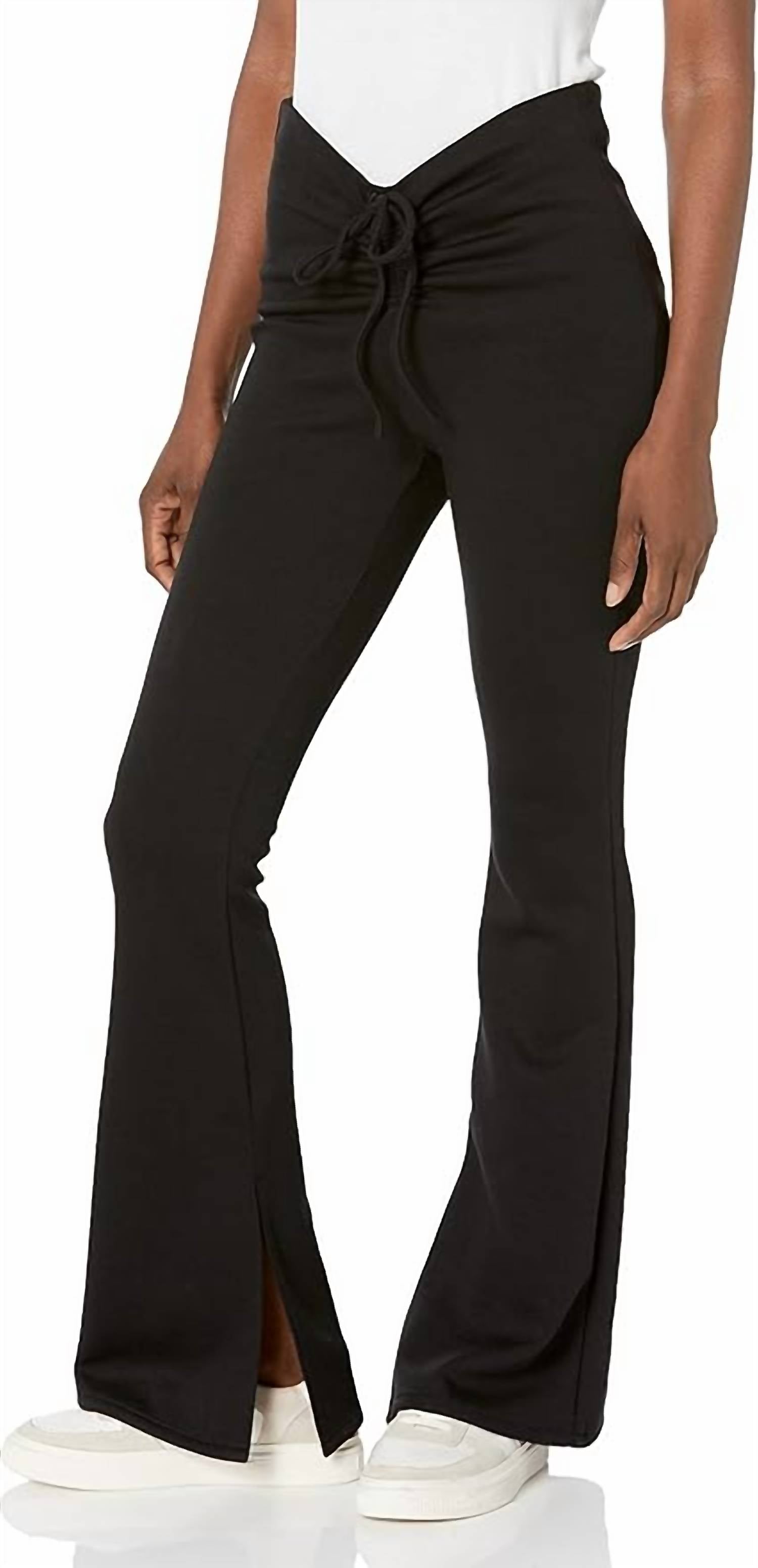 Stay on trend with these stylish boot cut pants that are fit to perfection. The perfect combination of comfort and fashion, you'll be grabbing for these all season long! Black Flare Pants with Drawstring Front by Blank NYC Black Flare Pants with Drawstring Front by Blank NYCRuched drawstring front at waistband slims the waist.Material: Rayon, poly, spandex blendJersey fabric with split detail at cuffs, bell bottoms ruched comfy long boot cut stretchy soft