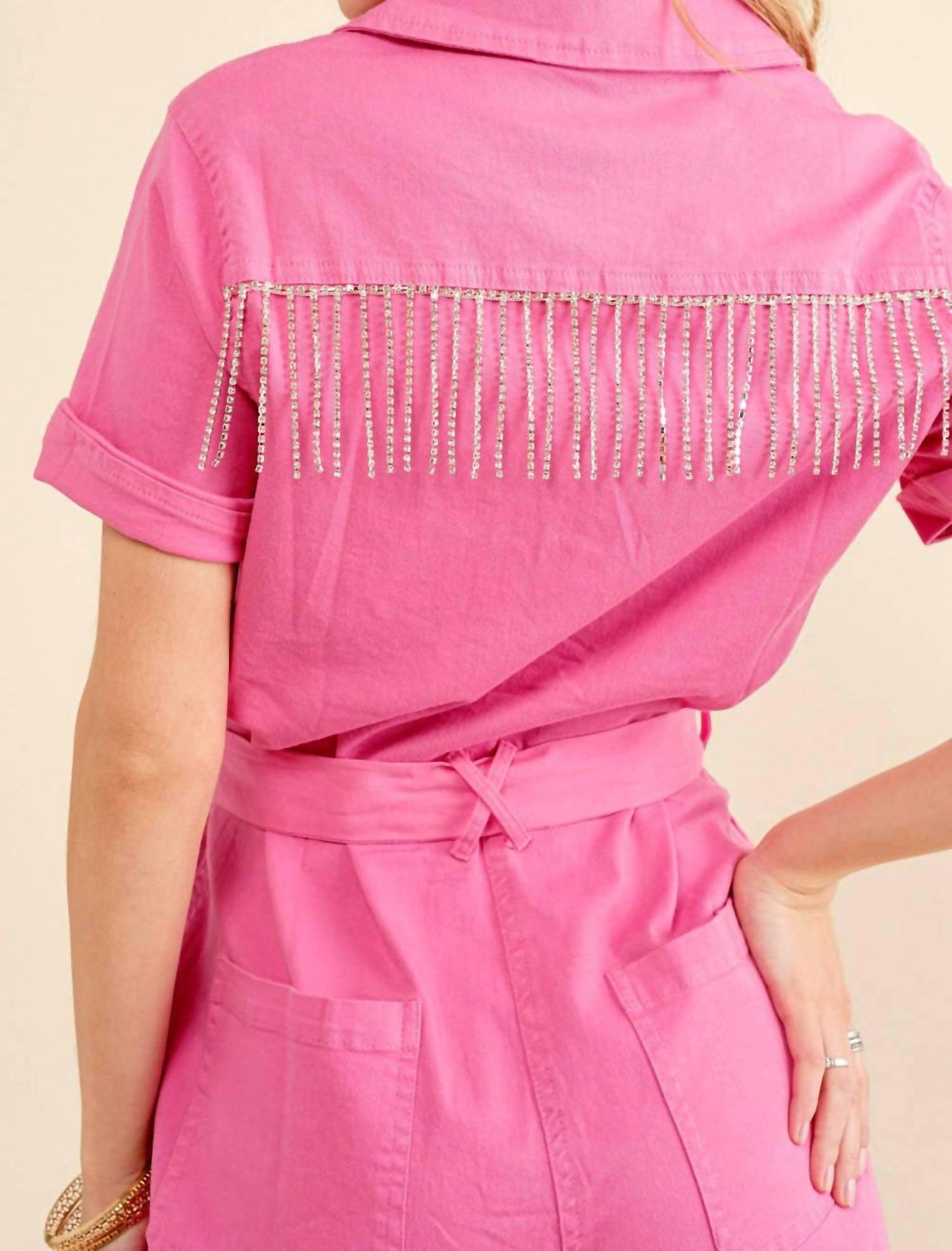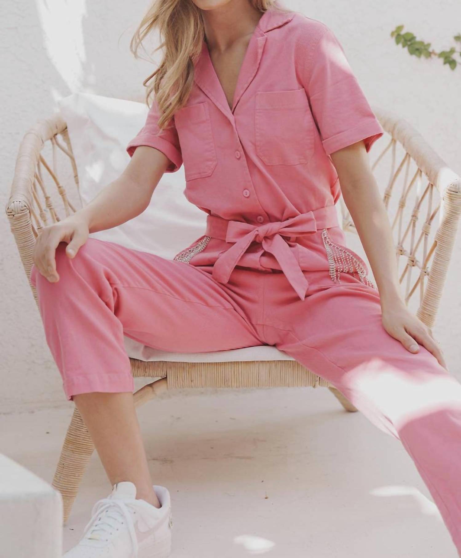 Embrace the Maximalist trend with the Blue B Utility Twill Stretch Tie Front Rhinestone Jumpsuit in a solid pink hue. Designed for women, this jumpsuit combines a relaxed fit with high-rise and straight-leg cuts, ideal for a summer holiday party. Adorned with rhinestone details, it features a tie front and practical pockets, securing with a button closure. Care is easy with machine wash and tumble dry instructions.