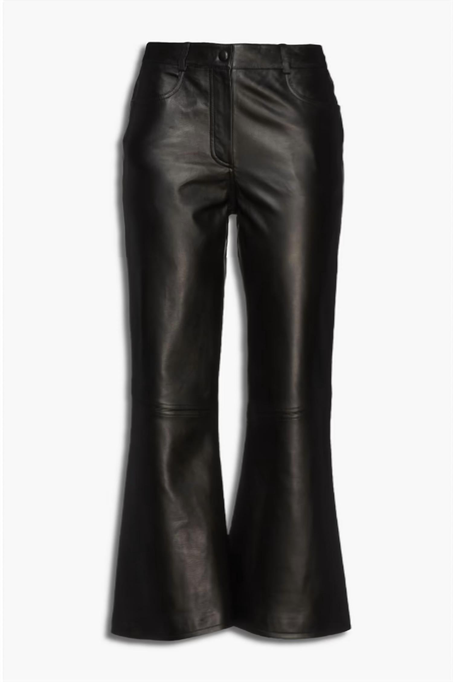 Unleash your style with the Leather Kick-Flare Pants by Boutique Moschino, perfect for an evening event or the spring season. Crafted from 100% supple, stretchy sheepskin leather, these black pants feature a relaxed fit with a mid-rise cut and flared leg for a chic silhouette. Details include two front slant pockets, two back patch pockets, belt loops, and a concealed snap and zip fastening at the front. Fully lined and featuring a mid-weight fabric, these pants are imported and require specialist clean care.