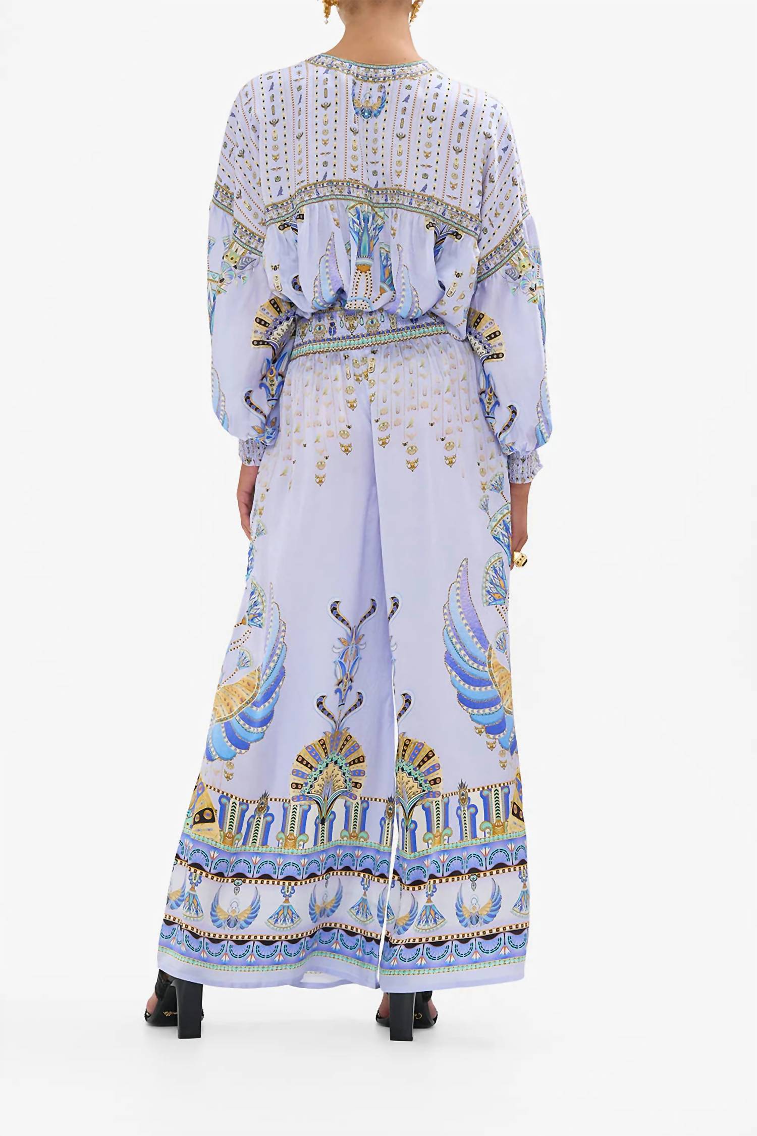 Introducing the Shirred Waist Pants by Camilla, crafted from 100% silk in the enchanting 'Under Scarab Skies' design. These full-length, wide leg trousers feature a shirred adjustable waistband and a flattering high rise fit, ensuring maximum comfort and style. Designed in Australia with exquisite crystal embellishments, these pants boast a relaxed fit with pockets and a pull-on closure. For care, dry clean only to maintain their luxurious appearance.