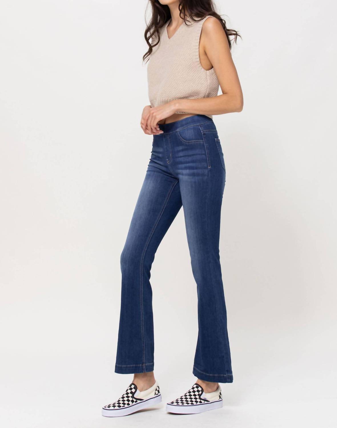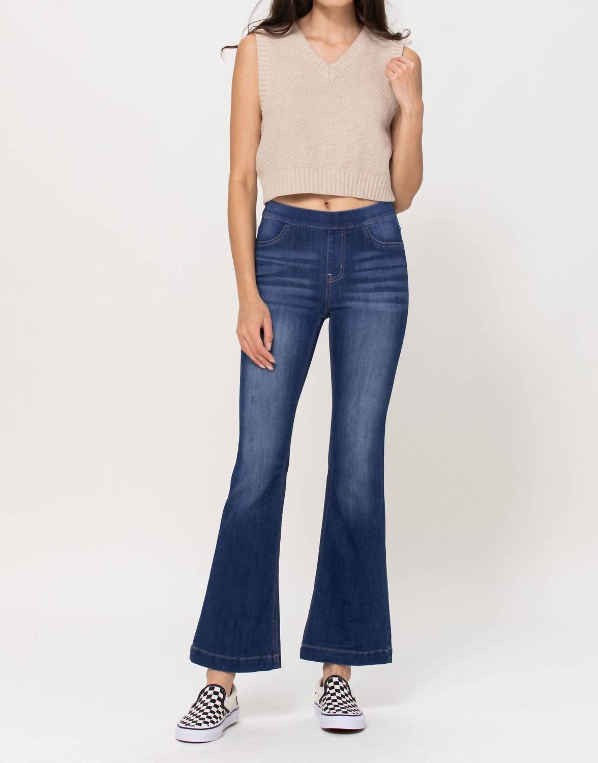 Discover the Flared Jegging by CELLO, a must-have for your wardrobe this season. These dark wash jeggings boast a mid-rise and flared leg design for a flattering fit. Made from a cotton blend of 57% Cotton, 26% Polyester, 15% Rayon, and 2% Spandex, these jeggings offer comfort and style in one. With a 30-inch inseam and a 9-inch rise, the pull-on style ensures ease of wear, while real back pockets add functionality. Imported and available in a dark denim wash, these jeggings are perfect for various fall outfits.