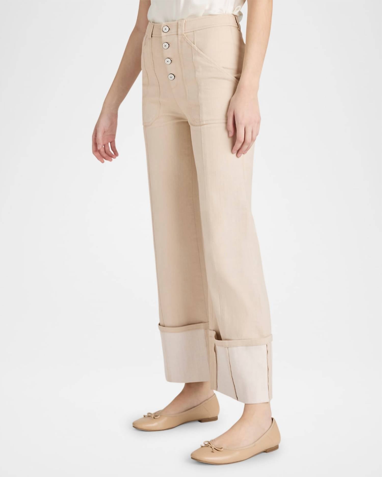 Elevate your wardrobe with the Cuffed Benji Pant by Cinq à Sept, a chic choice for any spring occasion. These khaki trousers boast a high-rise with an approximate 11.5" rise and a 29" inseam, crafted from a comfortable 75% Cotton 24% Polyester 1% Elastane blend. With a relaxed fit that flatters the hip and thigh and flared leg styling, they feature both front and back patch pockets for added functionality. A button closure and belt loops complete this minimalist look, while the cropped length adds a modern touch. Care: Dry clean only. Ideal for a holiday party, these pants effortlessly combine style and comfort.