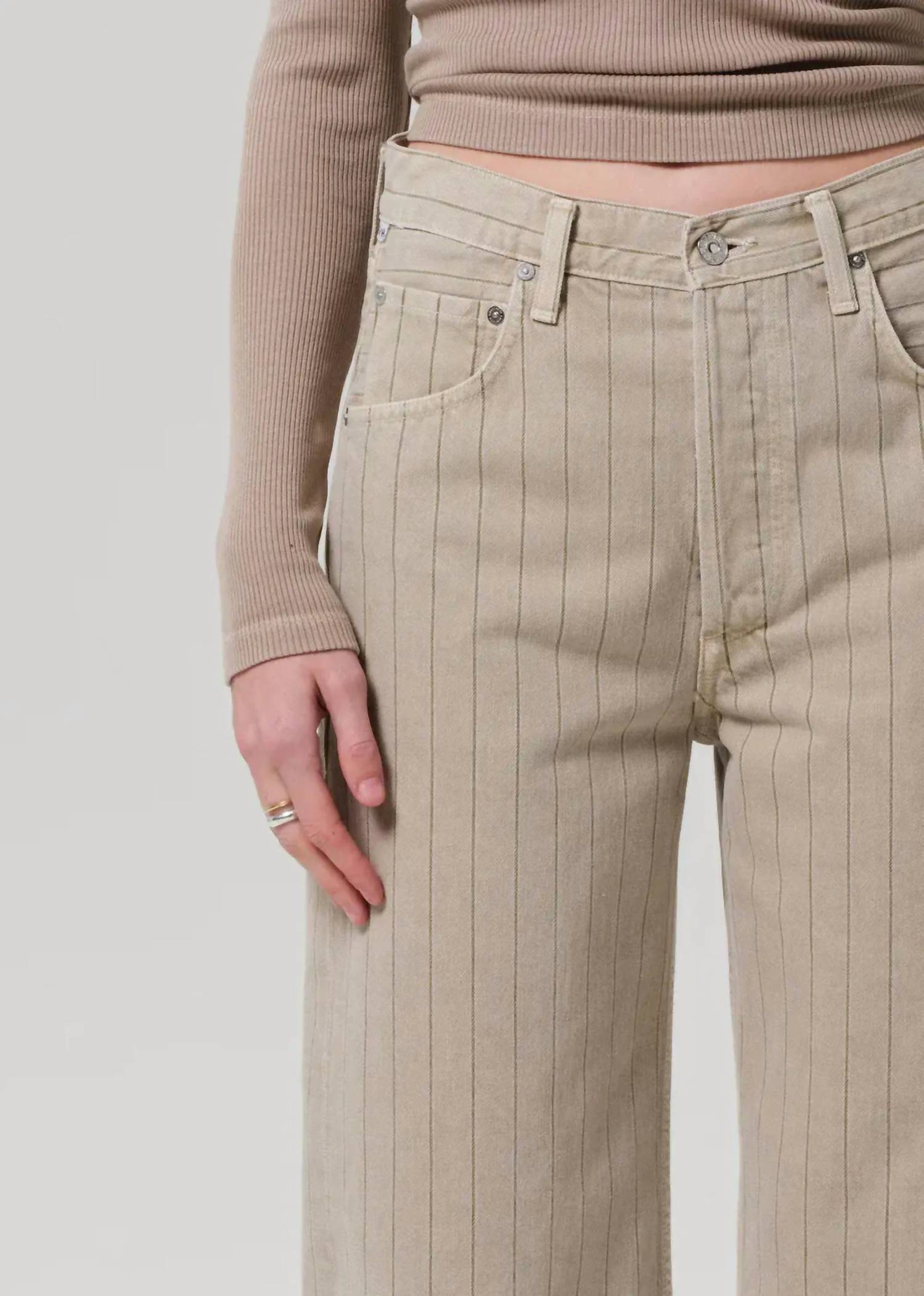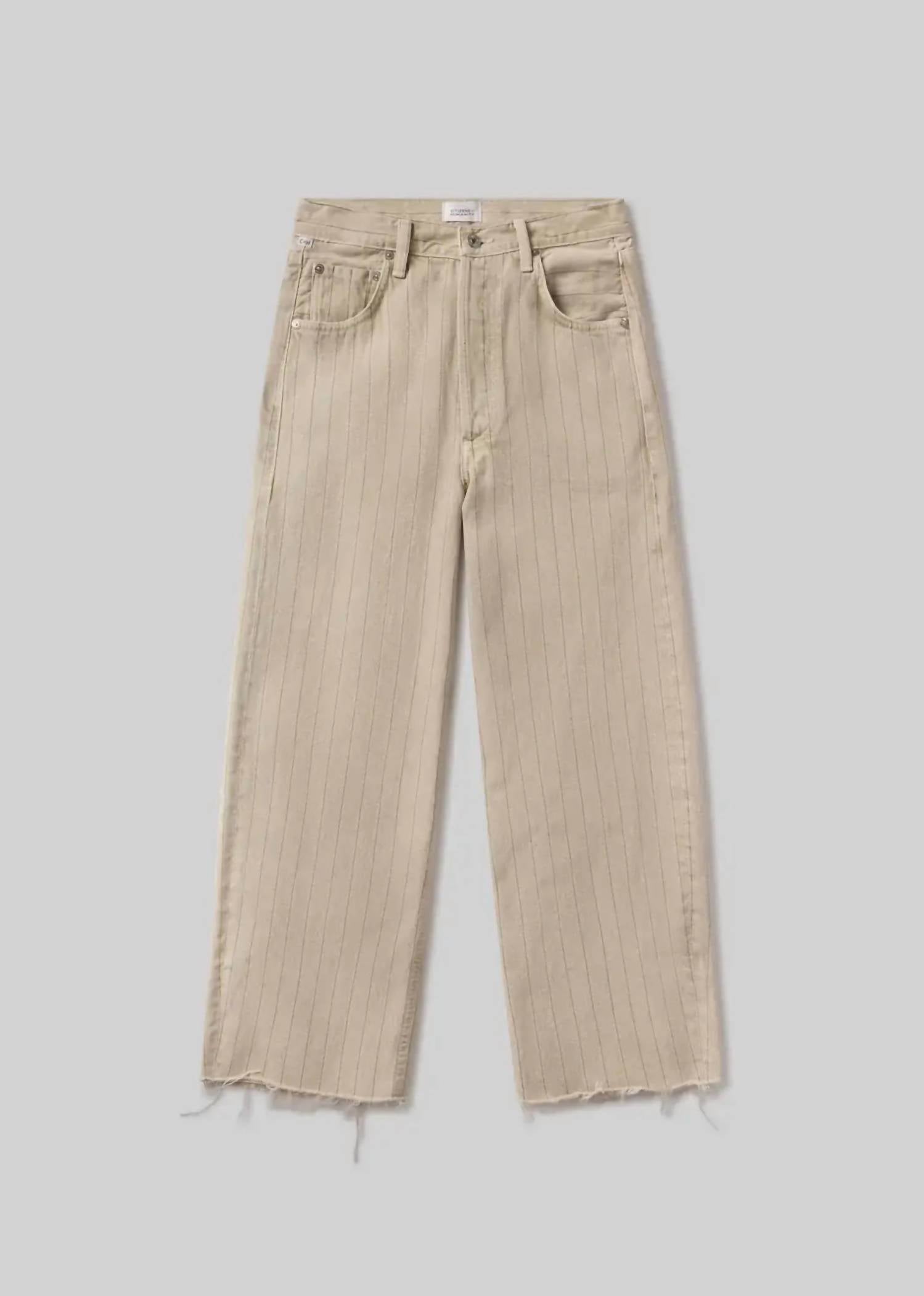 The Ayla Raw Hem Crop Pants by Citizens of Humanity boast a neutral stripe pattern in a rigid, non-stretch denim for an authentic feel. These wide-leg pants have a flattering top block with roomy untacked cuffed legs, and a high-rise fit with a 12 3/8" rise, 27" inseam, and 20 1/2" leg opening. Made from 100% cotton in the USA with imported materials, they feature a button fly closure. Care is easy with machine wash cold inside out with like colors and low tumble dry. Model is 5'10" and wearing a size 27.
