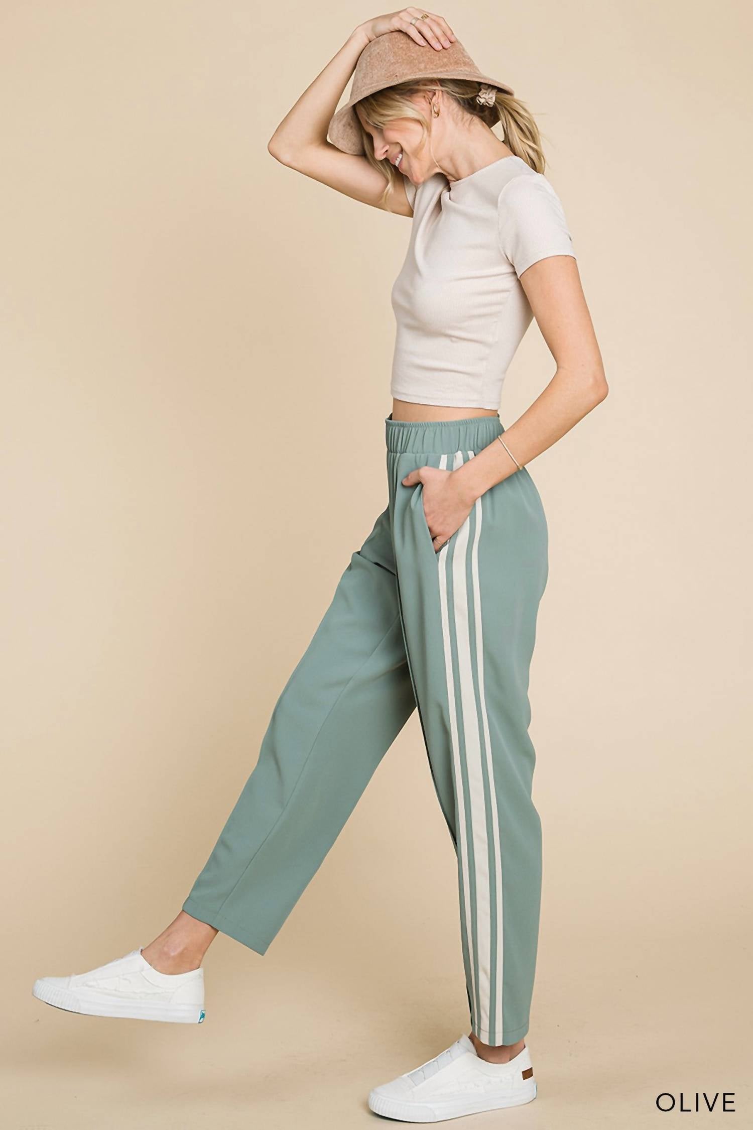 Cotton Bleu presents Women's Capri Pants in a chic olive green, perfect for a minimalist spring wardrobe. These capri pants feature a straight leg style with a pull-on closure for easy wear. The stripe pattern adds a touch of contrast banding detail, enhancing their back-to-school appeal. Designed without pockets, they embrace a sleek, streamlined look suitable for various occasions.