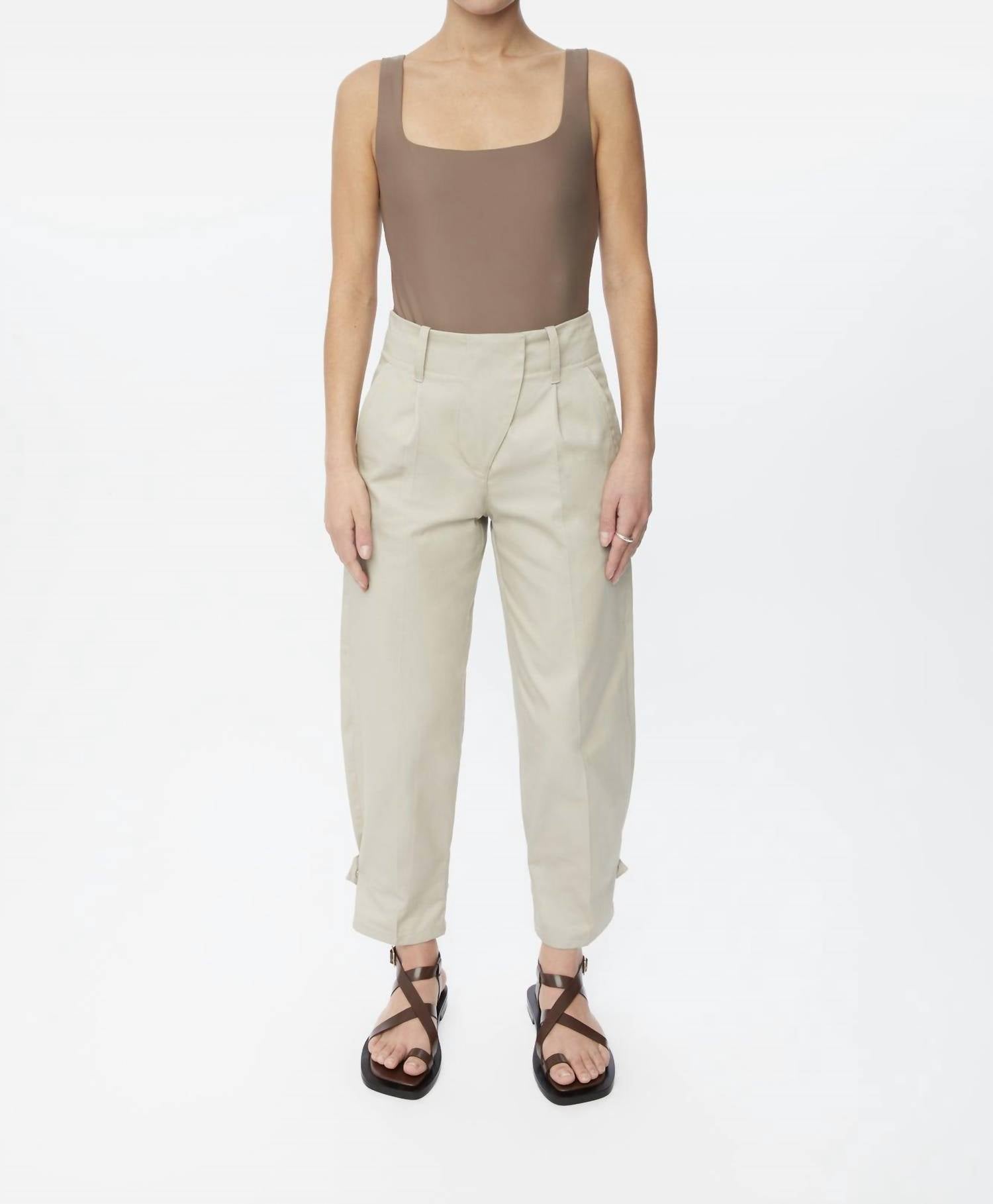 A calça capri casual e descolada perfeita. Entre no estilo com a Calça Cônica Utilitária Canvas da Dāl the Label, confeccionada em sarja de algodão canvas sólida para um visual minimalista em pedra. Com cintura alta e fecho de colchete, esta calça foi projetada para uma versatilidade confiante, completa com passadores de cinto e bolsos funcionais. O estilo afunilado da perna, combinado com um ajuste amplo e fechos de botão de pressão ocultos nos punhos, garante conforto e amplitude. As instruções de cuidado recomendam lavagem à mão e secagem em máquina, tornando esta calça uma escolha prática para o seu guarda-roupa de férias de primavera.