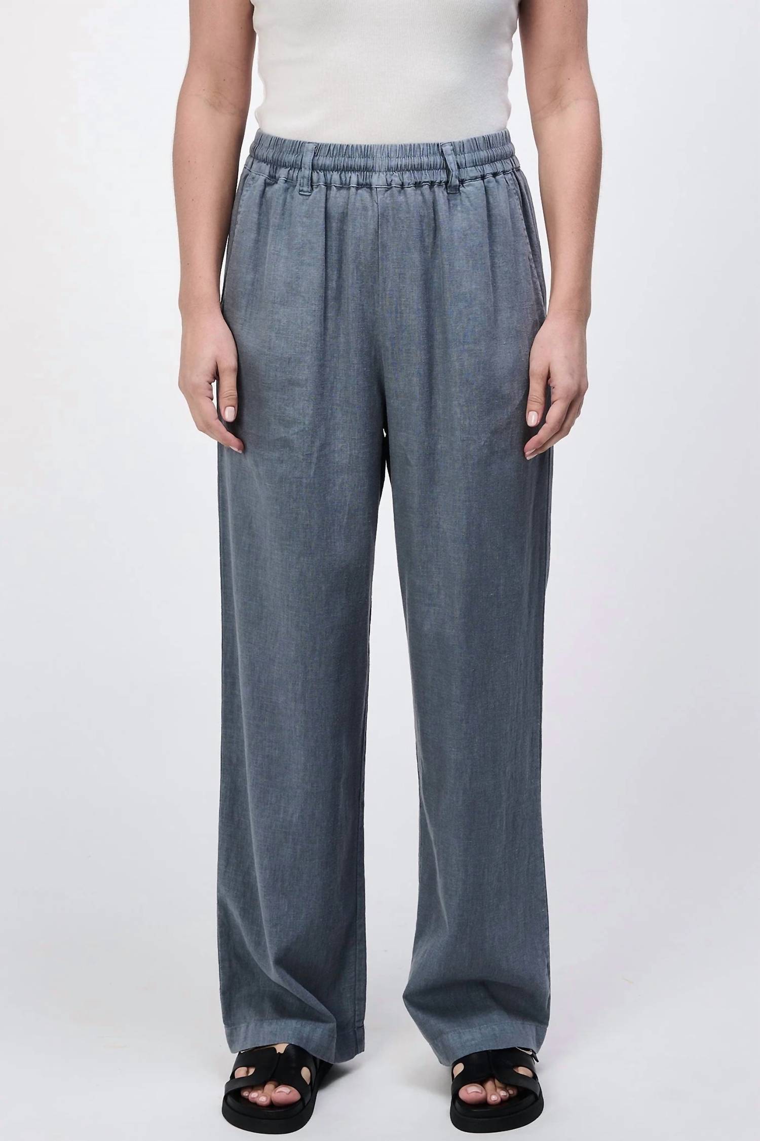 A perfectly tailored straight leg that you'll want in every color! Discover the Luke Straight Leg Pants by Dear John Denim, offering a relaxed fit with a wide-leg design in a chic Stormy Weather hue. These solid-patterned pants feature a convenient pull-on closure with a tie waist for an adjustable and comfortable fit. Crafted from a linen blend of 55% linen and 45% cotton, they are perfect for summer streetwear and casual outings. Care instructions include machine wash cold on a gentle cycle, line dry to avoid shrinkage, and warm ironing if needed. Model wears size small.