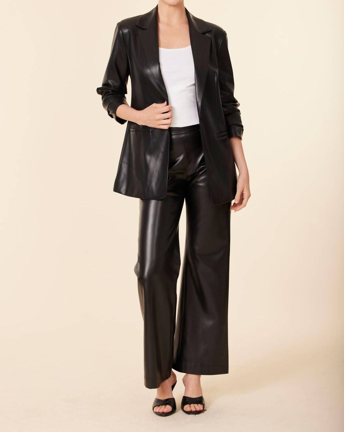 Introducing the Double Zip Pant by Dolce Cabo, a minimalist design perfect for a cocktail party. These black, bootcut pants are crafted from 100% polyurethane vegan leather with zip closures on each hip and feature faux back pockets for added style. Made in China, they offer a regular fit, making them suitable for a variety of ensembles. To maintain their sleek appearance, wipe with a damp cloth as needed.